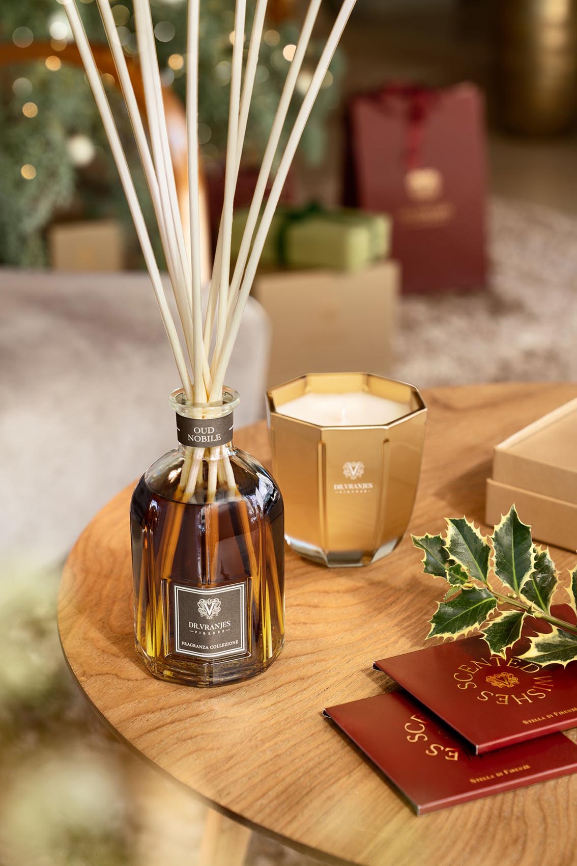 Oud Nobile est une fragrance qui unit Orient et Occident : la précieuse résine d’oud, accompagnée de myrrhe et d’encens aux accents orientaux, s’entrelace à la fraîcheur lumineuse de la bergamote méditerranéenne. Inspiré des rituels d’accueil dans les palais arabes, ce parfum rare et raffiné crée une atmosphère sophistiquée, idéale pour stimuler la concentration et apporter une élégance enveloppante aux intérieurs.