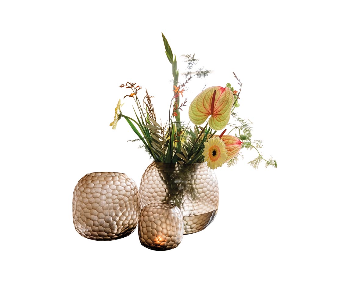Le verre martelé capte la lumière et la diffuse en reflets chauds, presque mouvants. Le vase s’impose comme une pièce signature, à la fois simple et expressive. À associer à des compositions légères pour prolonger la matière dans l’espace.