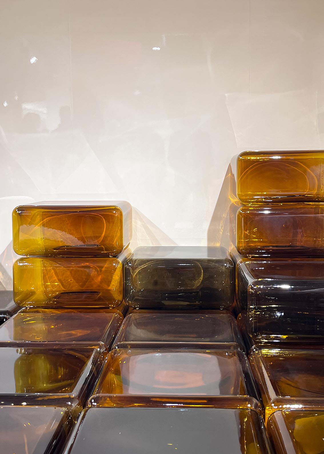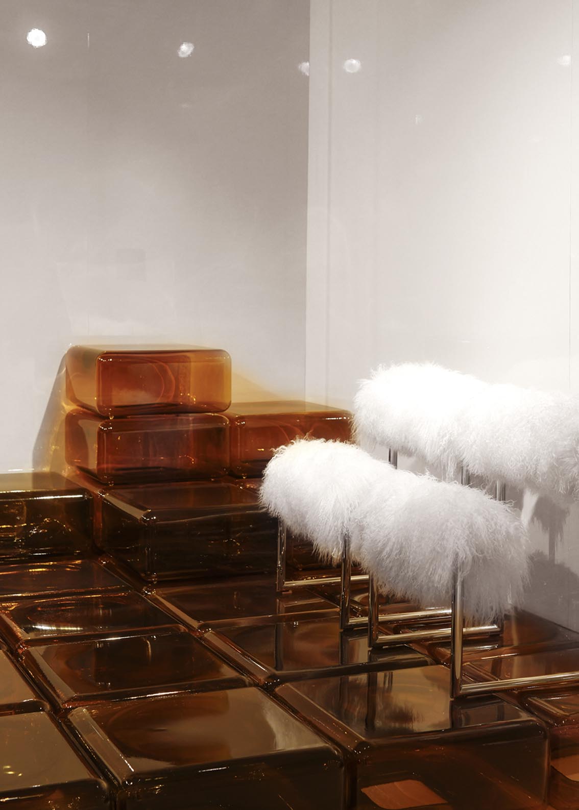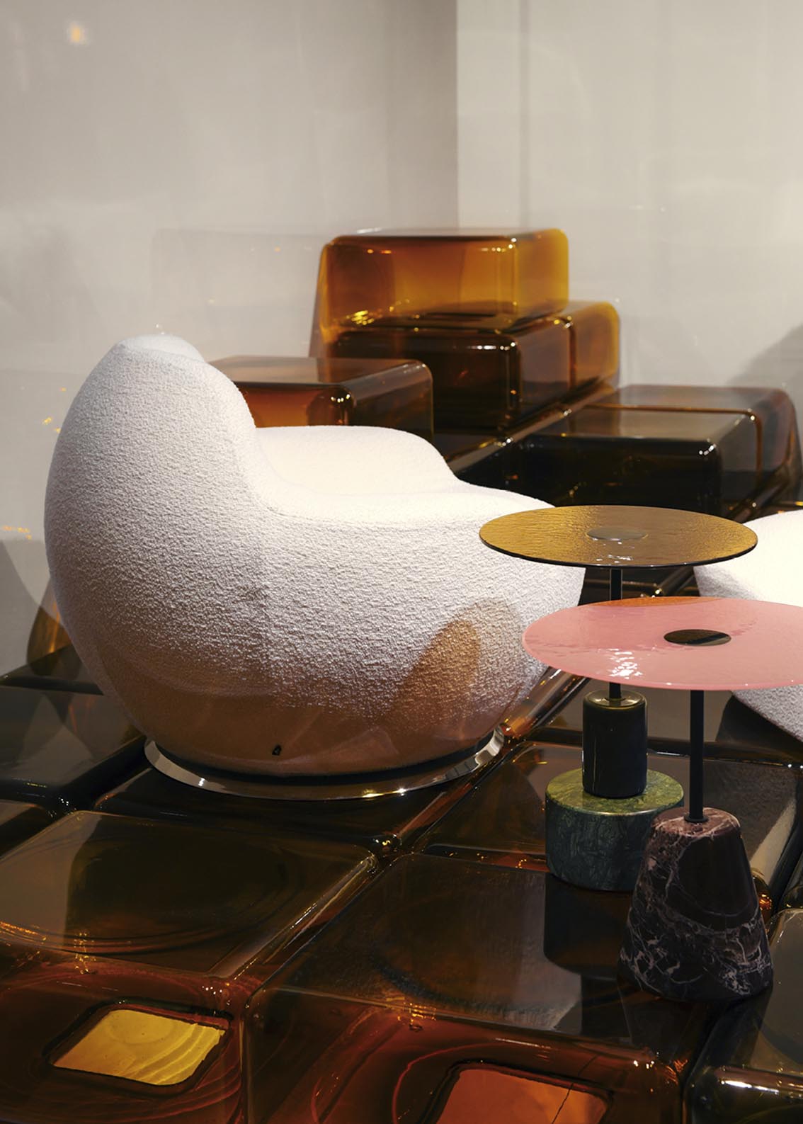 Les tables d’appoint en verre soufflé de Sabine Marcelis apportent profondeur et transparence, tandis que les icônes de la collection Remasters, telles que Palla et Due Più, rythment l’espace avec force et identité.