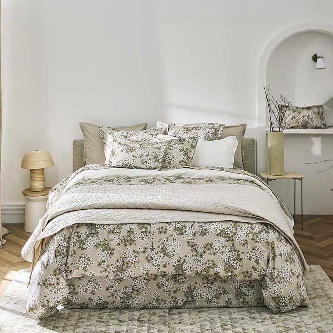 Inspirée des guirlandes décoratives du XIXᵉ siècle, la parure Vivienne revisite l’ornement avec un motif dessiné à la main. Disponible en Gingembre, un ocre orangé, ou en Pensée, un violet magenta lumineux, elle se distingue par ses aplats de couleur intenses et son style graphique moderne. La finition réversible et le passepoil ton sur ton apportent raffinement et flexibilité dans la décoration de la chambre.