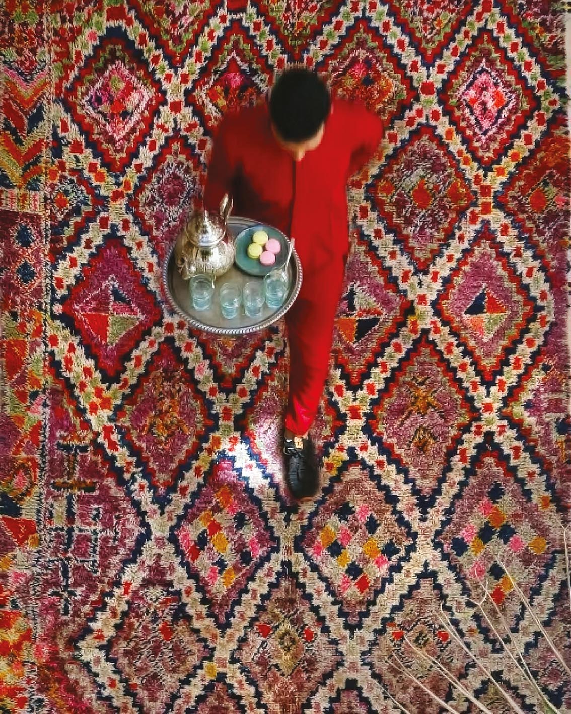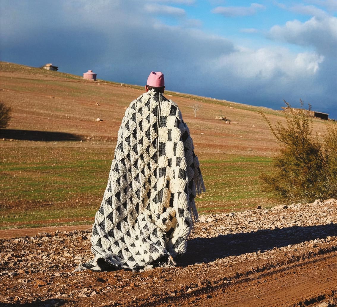 Studio LID transforme le tapis en matrice visuelle. La densité des motifs berbères fixe l’espace et impose une géométrie immédiate. La figure en rouge introduit un contraste radical, presque théâtral, qui attire l’œil et rappelle la force du rituel. Le plateau d’argent met en lumière l’acte de servir, geste social codifié au Maroc et porteur d’une valeur d’hospitalité. L’image articule ainsi matière, corps et symbole pour révéler l’artisanat comme langage collectif.