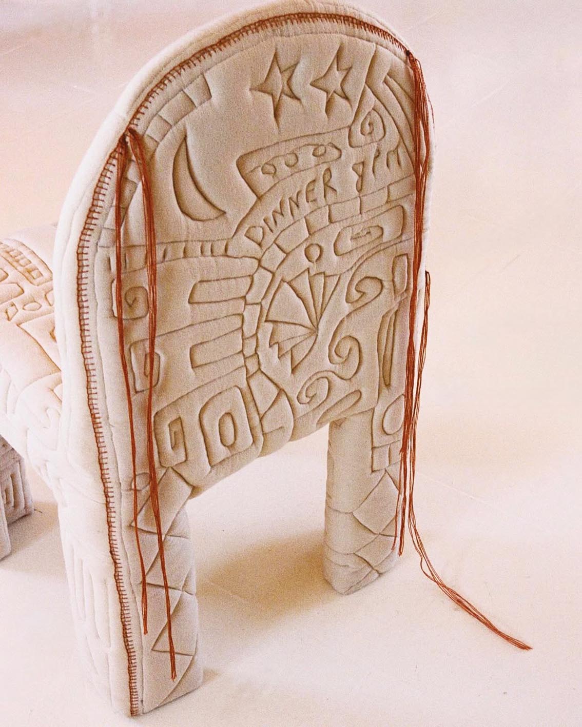 Le textile vert, associé à la baraka, se trouve travaillé par la broderie, geste féminin transmis de génération en génération. Flo & Jouls en font un objet hybride, à la fois ancré dans les traditions du salon et ouvert à une lecture contemporaine. Dans la fête, cette combinaison souligne la valeur symbolique de la couleur et la puissance narrative du fil.