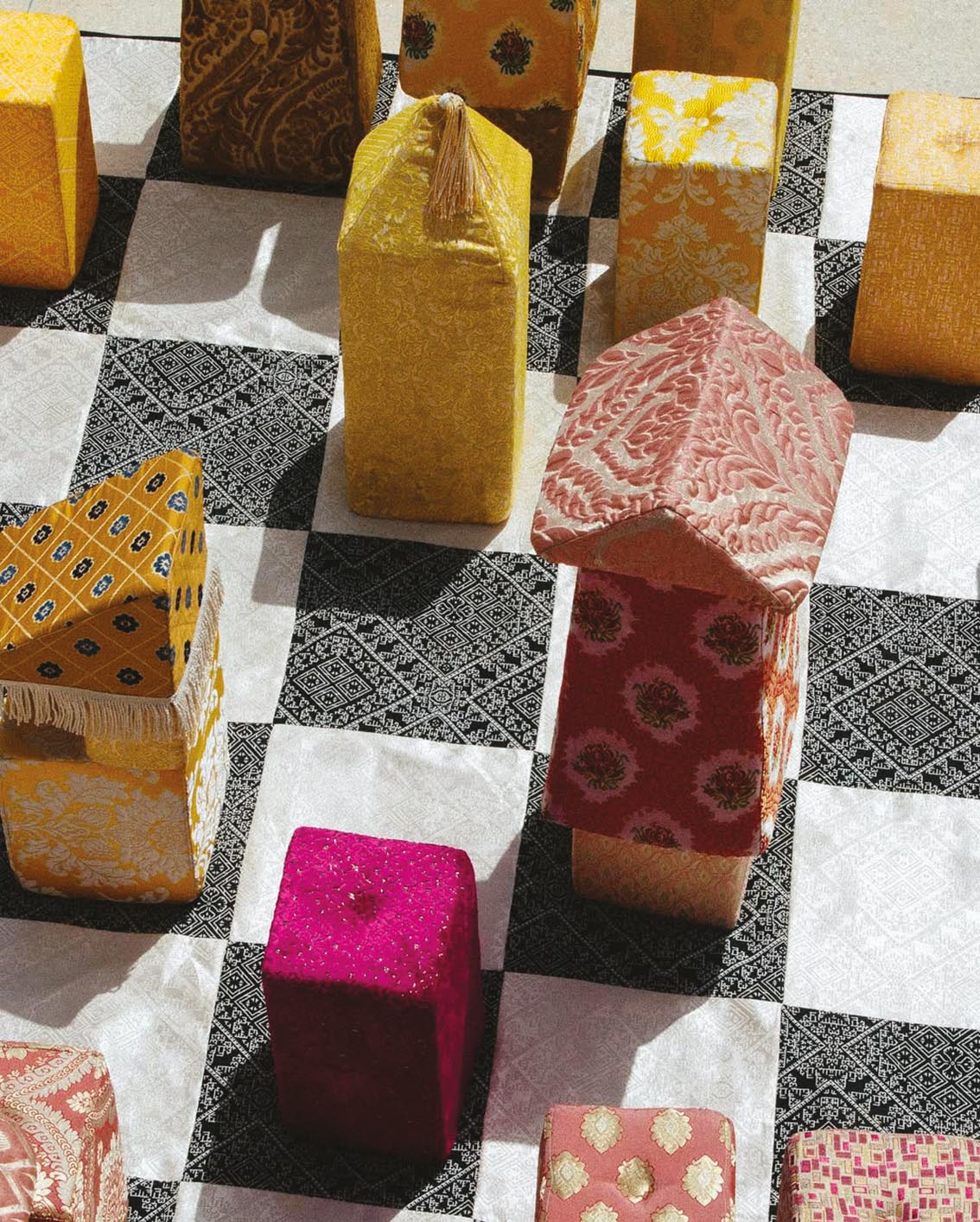 Le tissu de salon, porteur de respectabilité, prend chez Zoubida la forme d’un damier de poufs. Cette composition ludique déplace un matériau solennel vers une grammaire festive. L’artisanat montre ainsi sa capacité à engendrer de nouveaux usages et à réécrire les codes du majlis marocain.