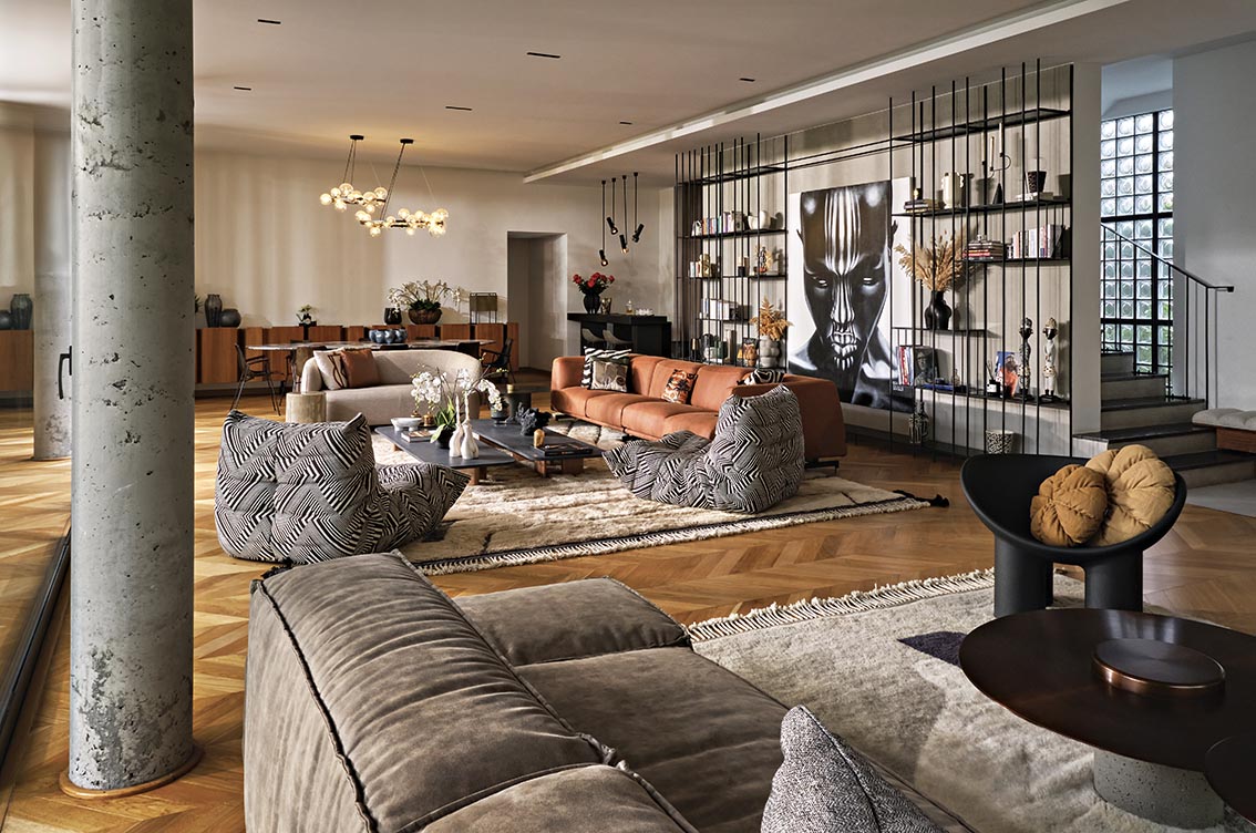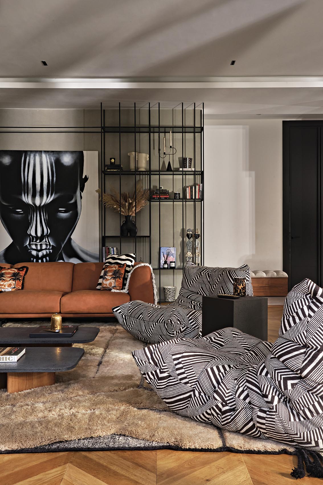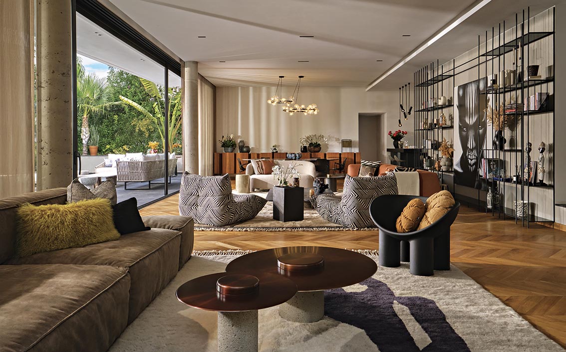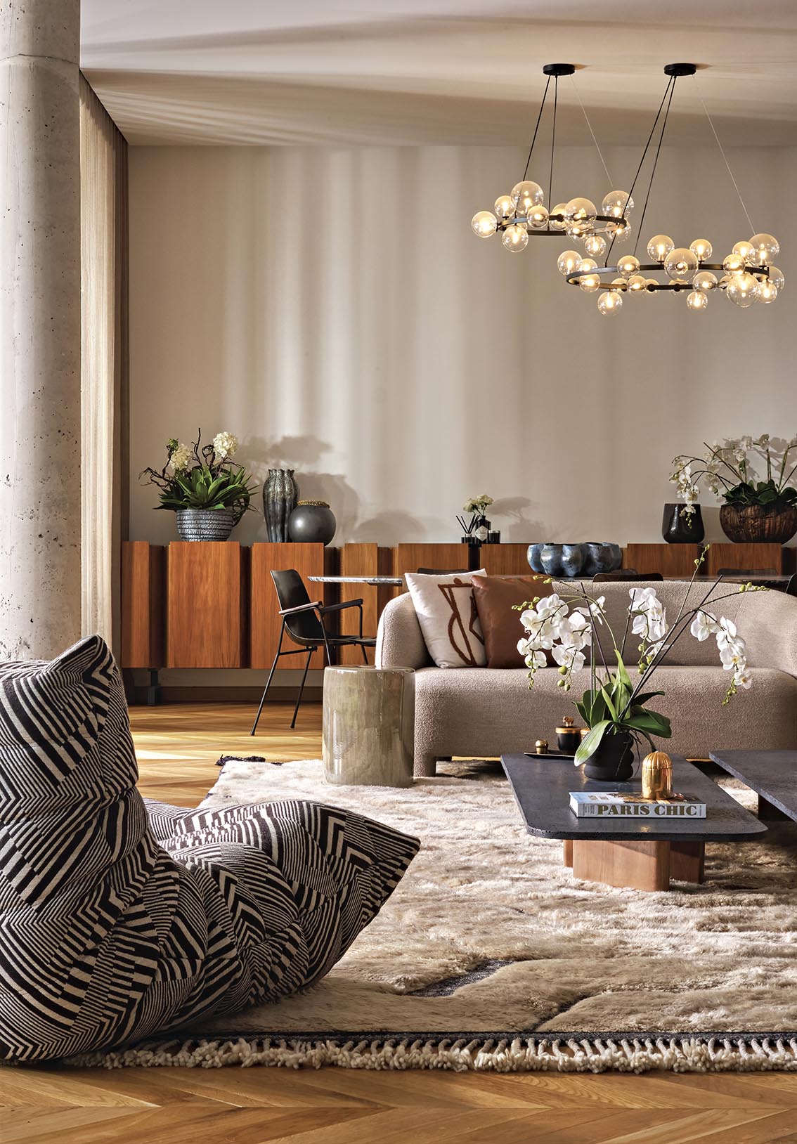 La composition repose sur une répartition équilibrée des masses : un canapé bas, tendu vers l’horizontale, dialogue avec un module graphique suspendu. La table centrale s’inscrit dans un registre minéral, sobre, dense. Le mobilier obéit à une logique de placement. Le vide entre les éléments devient un outil de respiration. La lumière naturelle module la scène avec douceur, sans contraste. La palette chromatique, tenue autour de tonalités terreuses et boisées, installe une concentration visuelle constante. Aucune dominante. Tout existe dans l’ensemble.
