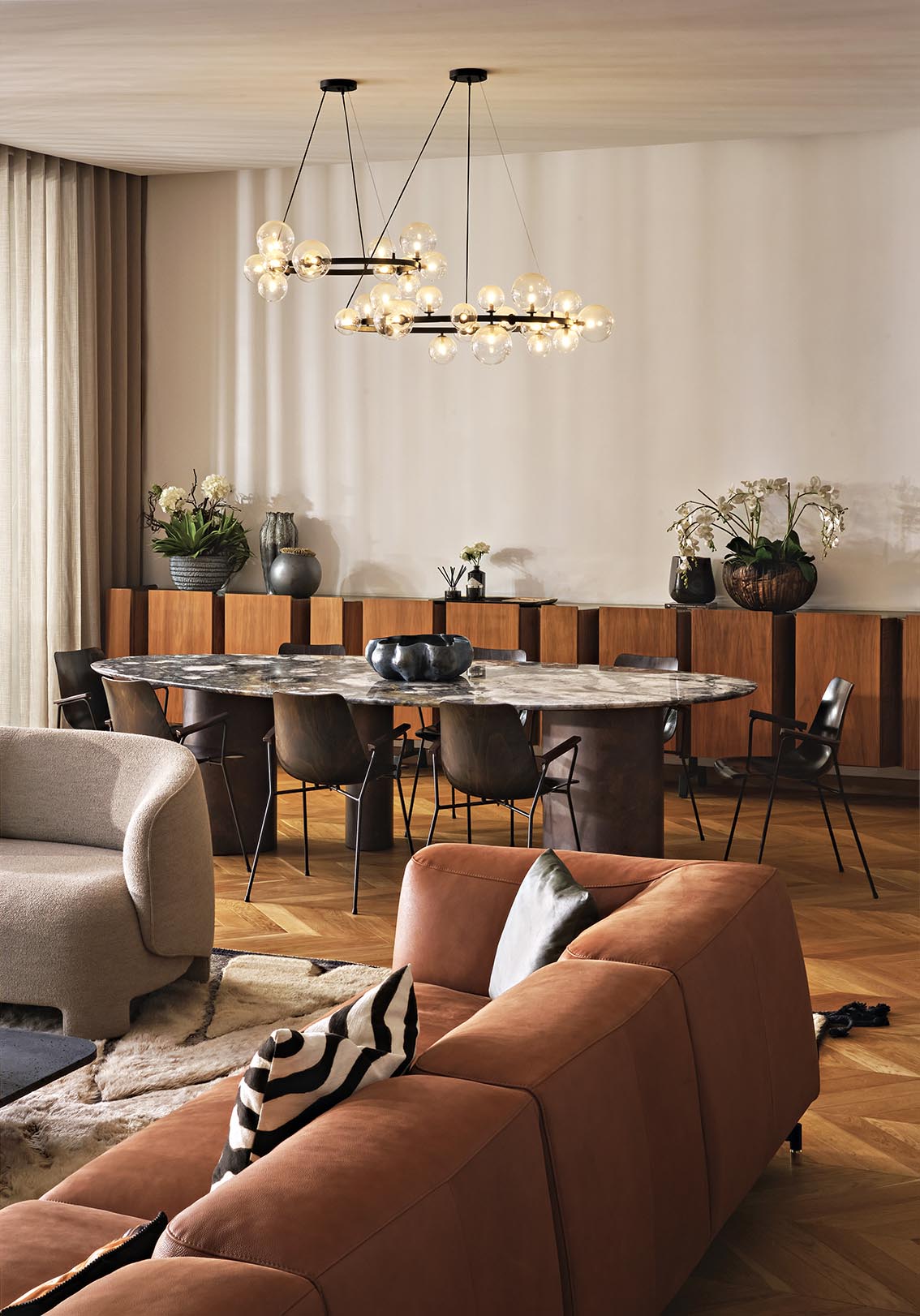 La table, aux proportions généreuses, s’ancre dans l’espace comme une fondation. Les assises, solides et discrètes, se tiennent à distance de tout effet spectaculaire. Le mobilier ne convoque aucun imaginaire extérieur : il assume sa fonction, tout en s’insérant dans une lecture architecturale plus large. Le traitement du plafond, neutre et maîtrisé, laisse toute la place au geste horizontal. L’ambiance repose sur un équilibre tactile entre les matières : bois lisse, pierre texturée, tissus mats. Le raffinement provient du rapport exact entre confort, tension et silence.