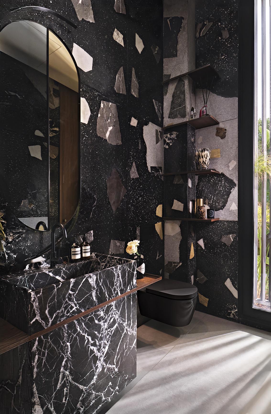 La pierre, utilisée en nappes verticales et horizontales, encadre l’usage avec autorité. La robinetterie disparaît presque dans la masse. Le miroir devient un outil de lumière, non d’esthétique. L’ensemble agit comme une parenthèse tectonique, où l’eau, la matière, la température et la géométrie construisent un environnement fermé, protégé, total.