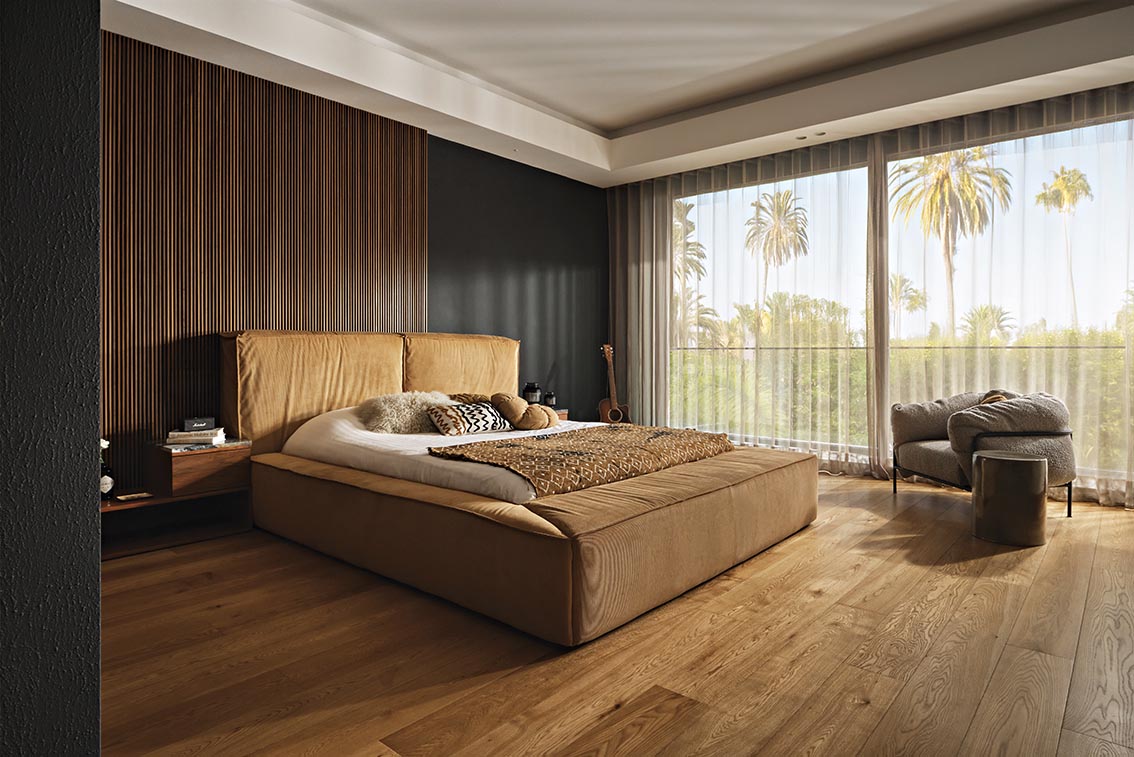 Le plan supprime toute dispersion. Un lit parfaitement centré, des volumes encastrés, des surfaces absorbantes. L’œil rencontre peu de distraction. Les matières induisent un rapport direct au repos, à la densité, à la lumière indirecte. Ici, le projet renforce la sensation d’unité. Rien ne dépasse, tout se tient.