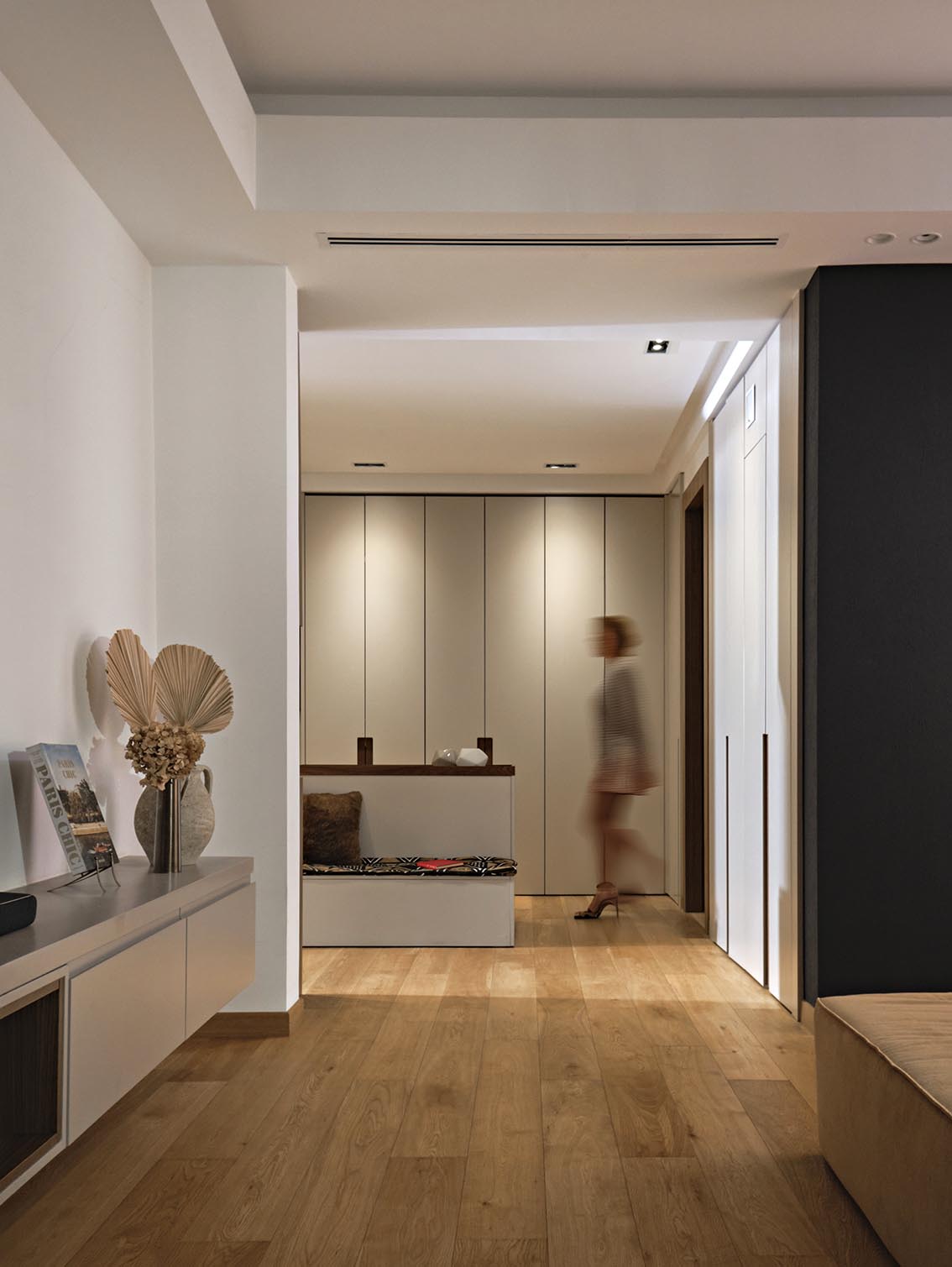 Aucun couloir ne cherche à disparaître. Chaque segment du parcours affirme son rôle : orienter, ralentir, anticiper. L’articulation entre zones publiques et zones intimes s’effectue par inflexions. Les seuils sont perceptibles, sans dramatisation. Le langage spatial reste cohérent, fondé sur la répétition des rythmes, la variation des hauteurs, l’alternance entre ouvert et contenu.