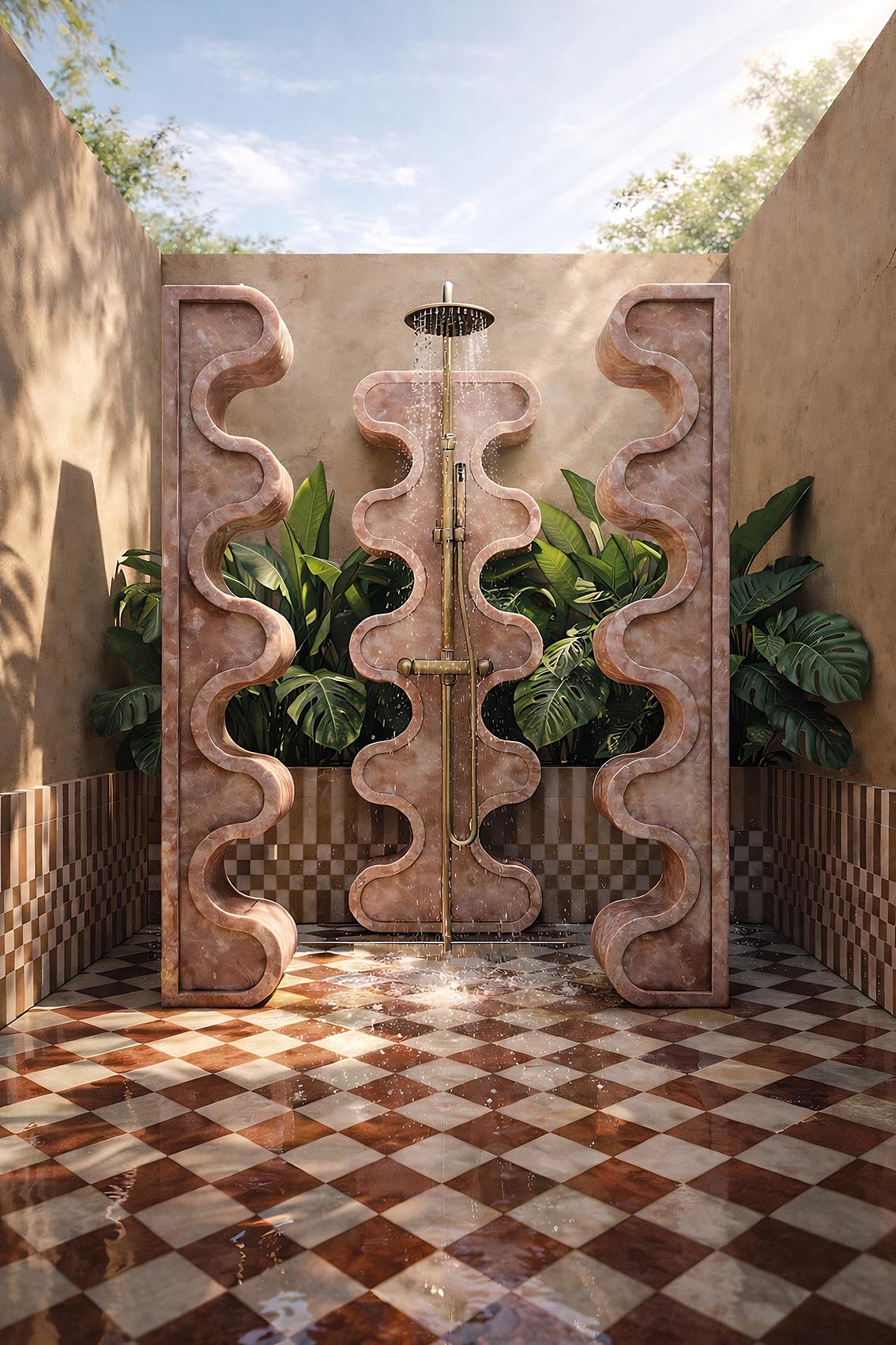 Entre marbre rosé, lumière naturelle et végétation dense, cette douche extérieure devient une installation. Les formes sculptées cadrent l’eau et transforment l’usage en expérience, dans une écriture où architecture et paysage dialoguent avec précision.
