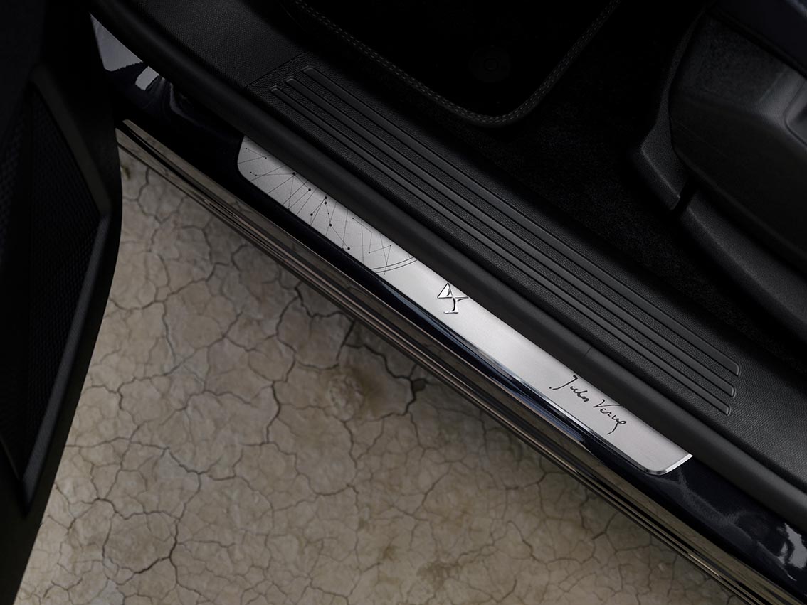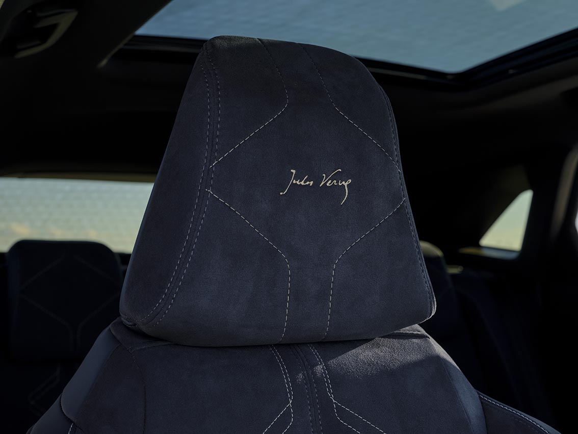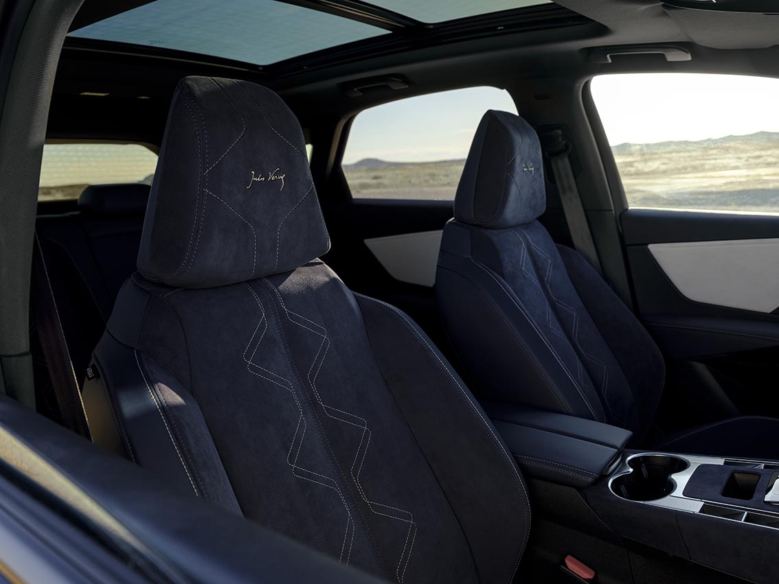 Déclinée dans des nuances de bleu profond inspirées des univers maritimes et célestes de l’écrivain, la DS 7 Jules Verne se distingue par des détails évocateurs : badges guillochés en forme de constellations, gravures de ballons dirigeables et signature du romancier apposée dans l’habitacle. Tout un univers narratif qui transforme chaque trajet en aventure poétique.