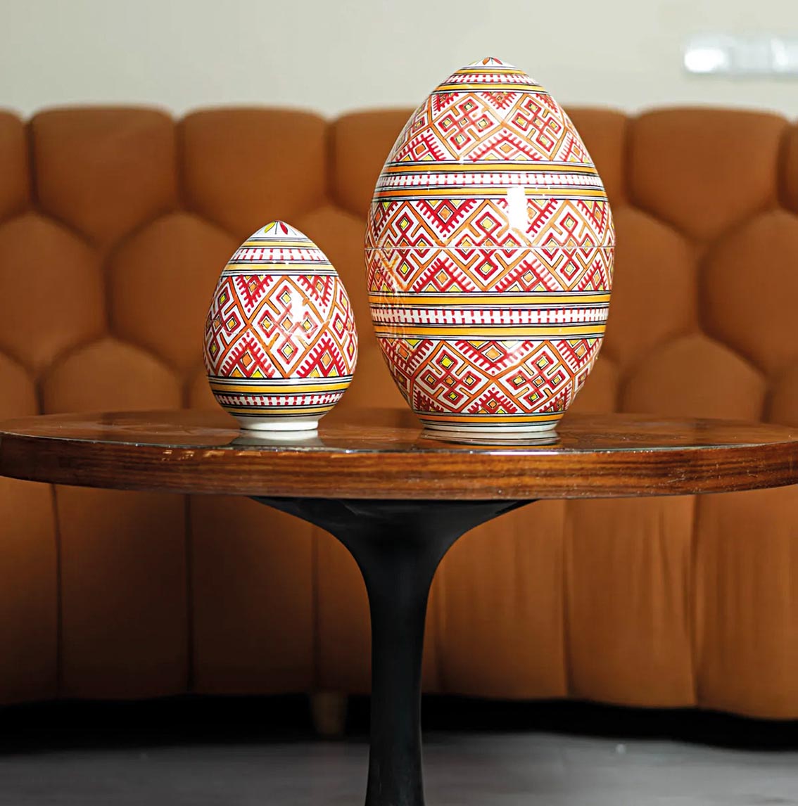 Inspirée des codes décoratifs maroco-andalous, cette pièce en céramique détourne la forme de l’œuf pour en faire un objet domestique à forte charge symbolique. La feuille d’or, appliquée à la main, dialogue avec des teintes chaudes: rouge, orange, jaune, et capte la lumière comme une surface vivante. À l’intérieur, une cire végétale de soja accueille des parfums profonds ou solaires.