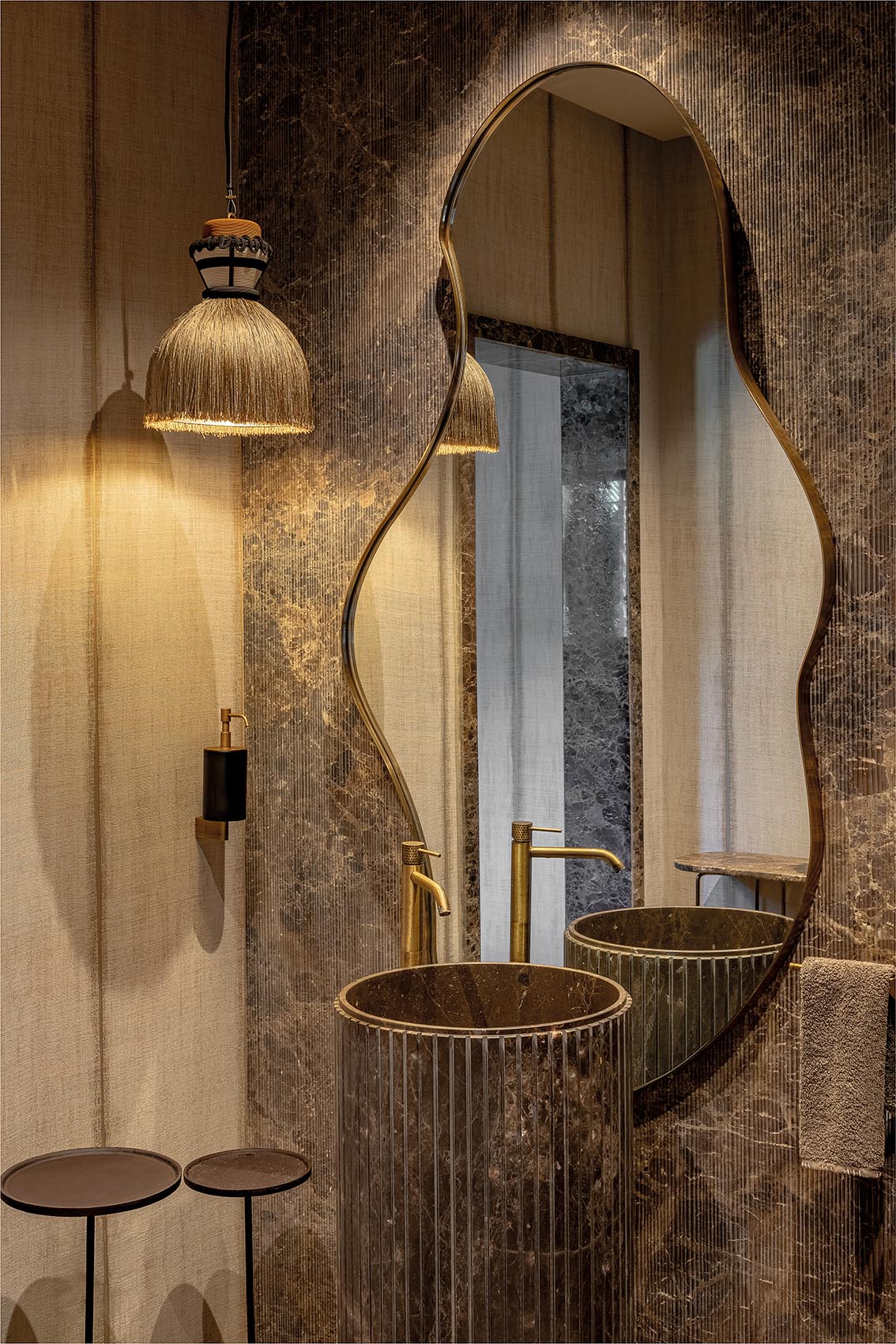 Dans cette salle de bain sculpturale, la matière capte la lumière et crée une atmosphère enveloppante, presque sensorielle.
