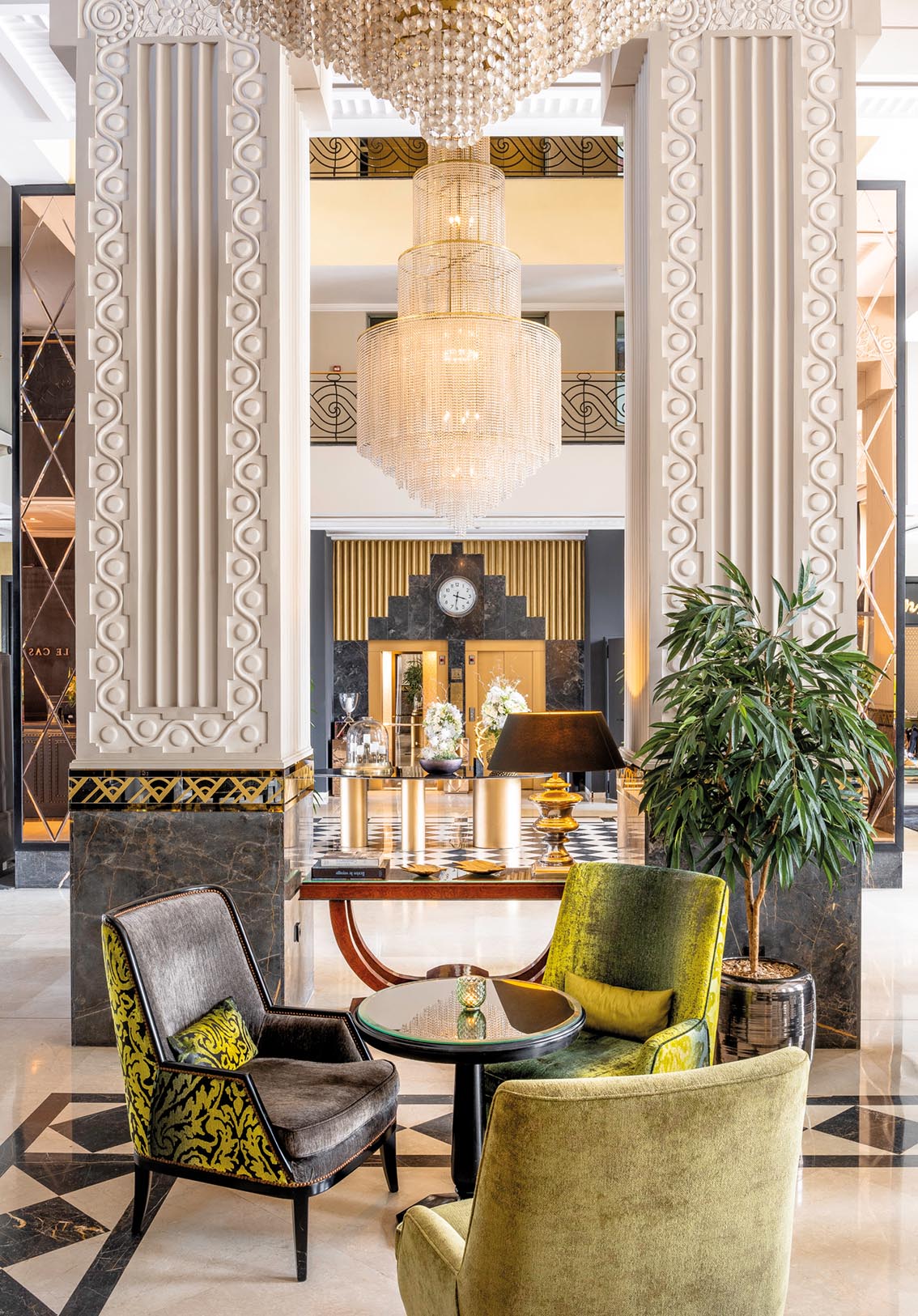 L’architecture intérieure privilégie des volumes mesurés, des circulations fluides et une palette feutrée. Colonnes sculptées, sols graphiques, jeux de lumière et matières nobles composent un décor élégant, à la fois structuré et chaleureux.