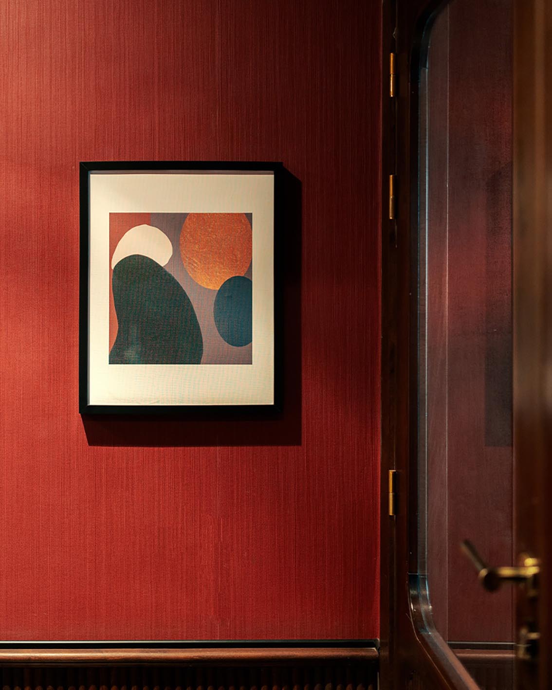 À l’intérieur, les volumes sont équilibrés, les matières nobles et les motifs graphiques subtilement convoqués. Boiseries, textiles feutrés et palette chaleureuse composent une atmosphère intime, pensée comme celle d’un hôtel particulier plus que d’un hôtel urbain classique.