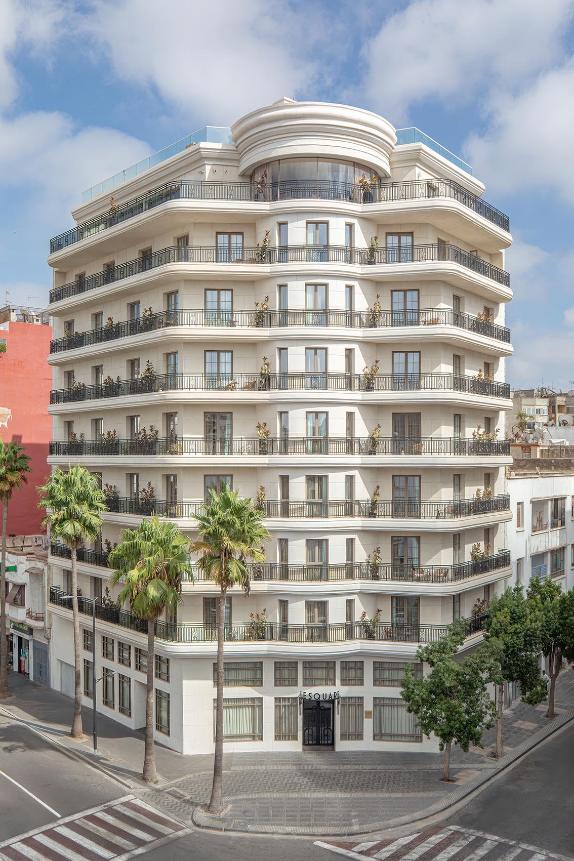 Situé dans le quartier de Gauthier, Le Square s’inscrit dans la continuité de l’architecture Art Déco de Casablanca, qu’il réinterprète avec une écriture contemporaine mesurée. L’immeuble affirme une présence urbaine élégante, rythmée par des lignes courbes, des volumes étagés et des détails graphiques inspirés des années 1930.