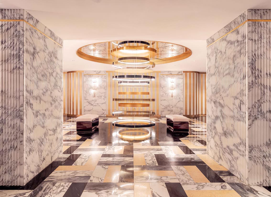 L’architecture intérieure privilégie des volumes mesurés, des circulations fluides et une palette feutrée. Colonnes sculptées, sols graphiques, jeux de lumière et matières nobles composent un décor élégant, à la fois structuré et chaleureux.