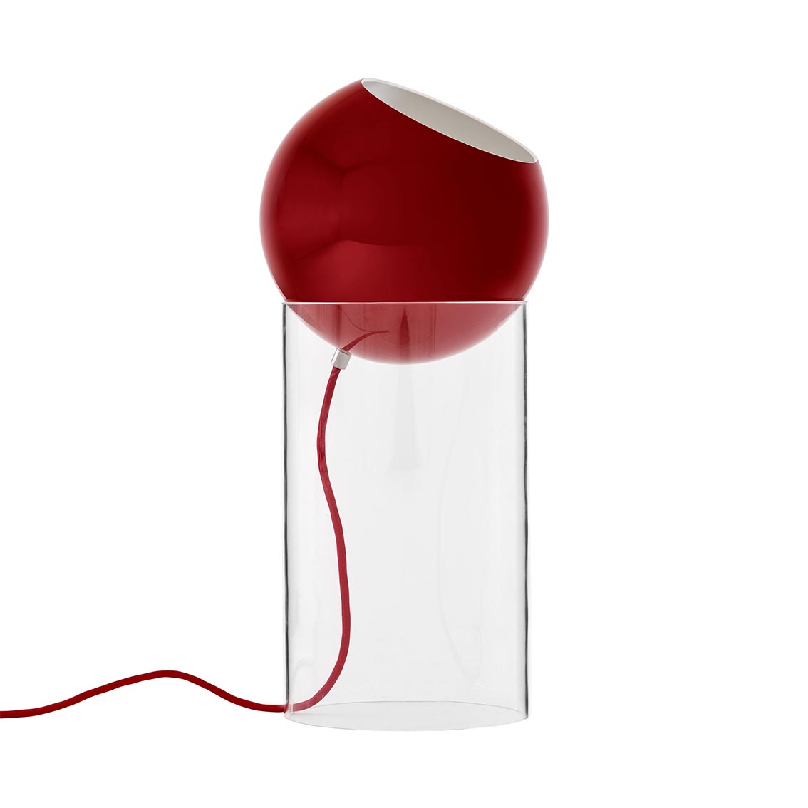 Imaginée par Verner Panton en 1959, la lampe Topan VP14 revient dans une version à poser. Sphère en métal rouge vermillon, diffuseur orientable :