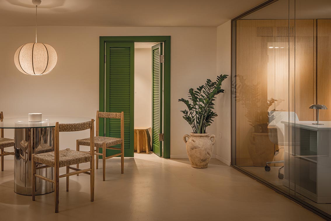 L’identité du lieu s’est construite dans les détails qui s’inscrit dans une cohérence d’ensemble. Halo c’est une agence avec un vrai ADN, pleine d’âme et d’authenticité, même d’excentricités par moment, c’est pour ça qu’on peut retrouver une lampe avec un abat-jour à frange, à côté d’une porte persienne verte, dans un univers doux et ultra minéral, tout en faisant un clin d’œil à la techno underground, le fil conducteur a toujours été de respecter tout cette effervescence qui donne à l’agence son cachet unique.