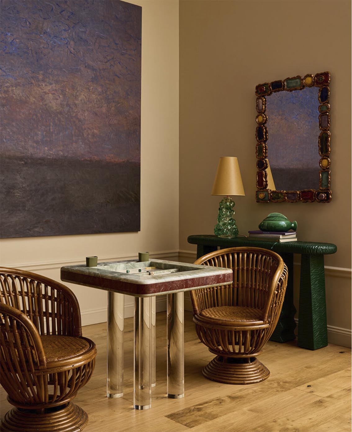 Au-delà de la lumière, Laura Gonzalez étend cette recherche de formes nouvelles à une sélection de mobilier : la table Quilt aux lignes colorées et résine teintée, le fauteuil Relief aux courbes sculptées comme un terrain, ou encore le miroir Eternal, encadré d’éléments en céramique rappelant des formations géologiques.