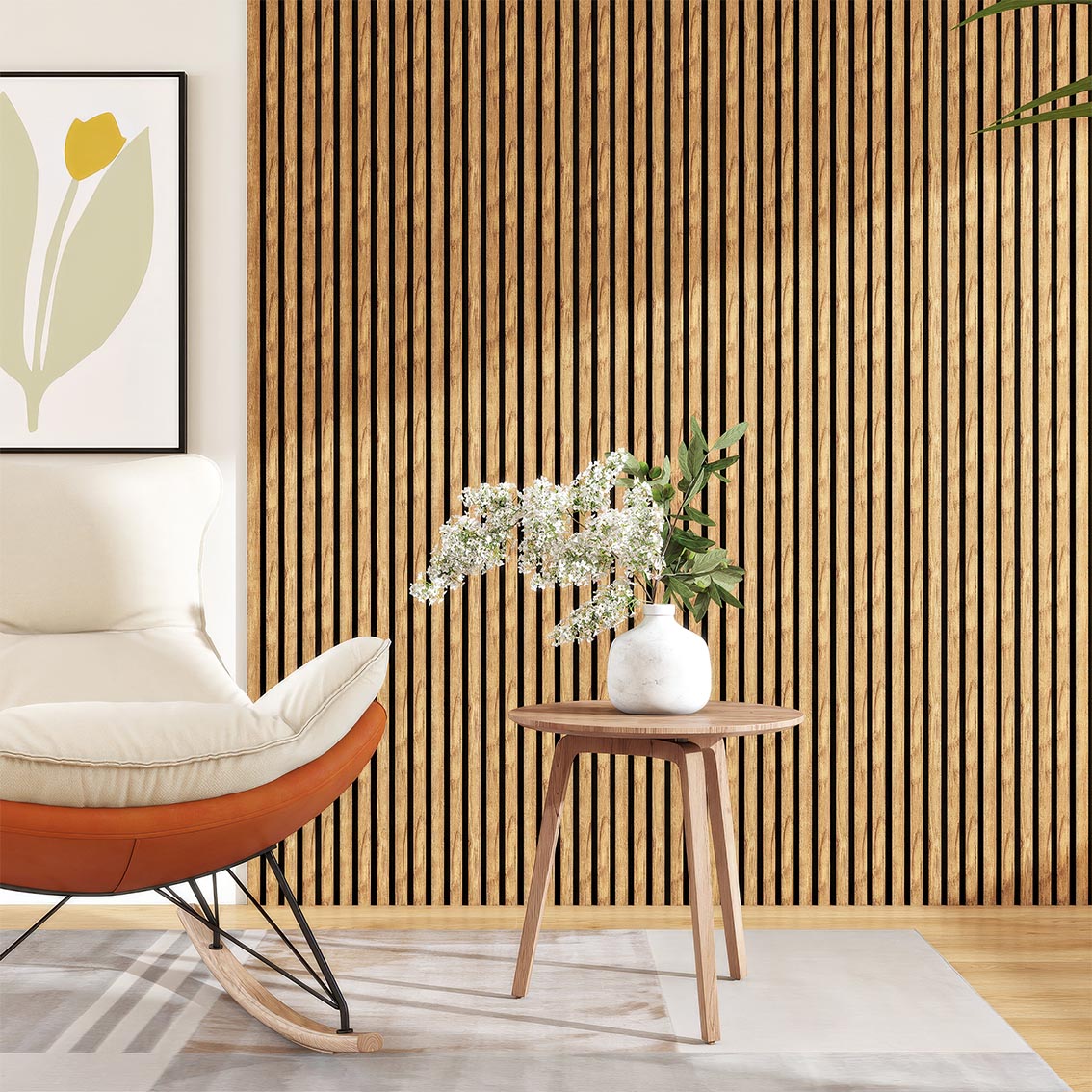 Le revêtement Ripado de Interior Canela joue sur la verticalité et les lignes régulières du bois cannelé pour structurer les surfaces. Les lames longues, avec leurs rayures texturées, créent un motif linéaire qui guide le regard et apporte profondeur et cadence à l’espace, tout en renforçant la connexion visuelle entre sol et mur.