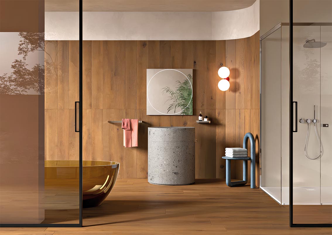 Avec Brown Oak, Revigrés interprète le bois dans un grès cérame à la texture profonde et aux nuances naturelles. Le veinage marqué apporte rythme et relief aux surfaces, tout en garantissant résistance et stabilité. Un revêtement pensé pour créer des espaces chaleureux, continus et durables, du sol aux murs.