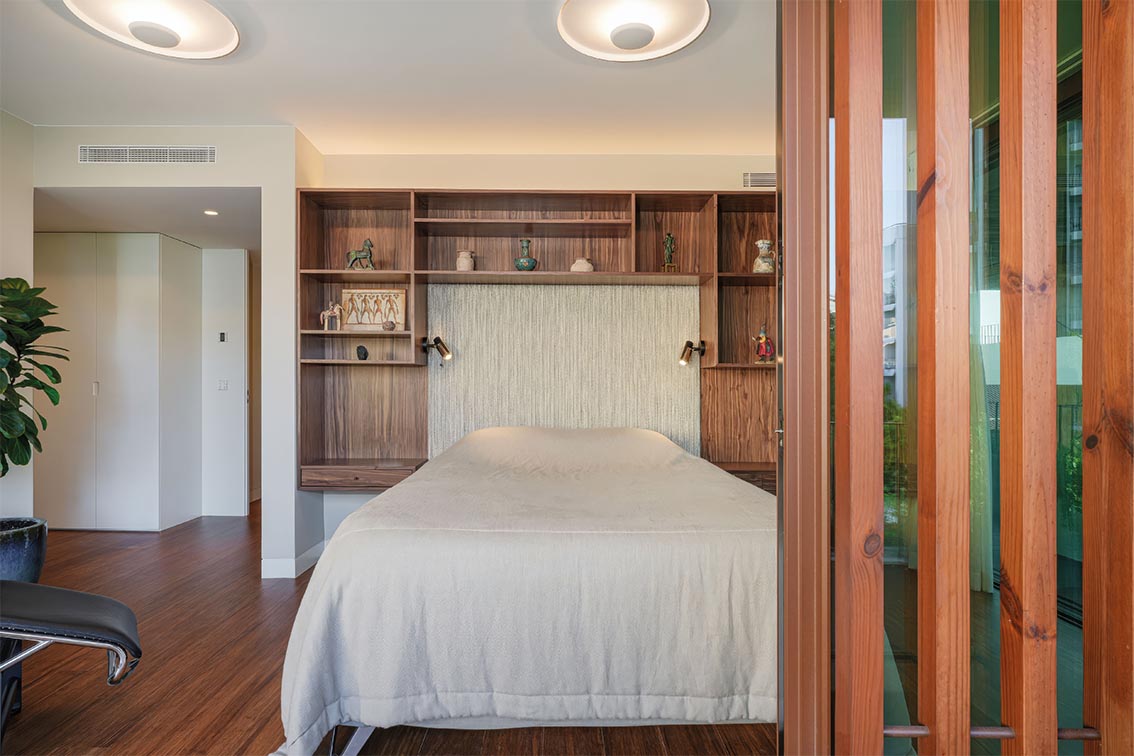 Ici, le rythme ne vient ni d’un objet, ni d’un mobilier. Il vient du mur, du sol, de la peau même du lieu. Le design portugais compose avec les matières pour structurer la perception : les cannelures sculptent la lumière, les veinures du marbre accompagnent la géométrie, les volumes s’organisent dans une respiration continue. Le revêtement agit comme un fil narratif : il guide sans imposer, relie les fonctions sans cloisonner. Une écriture spatiale sobre, précise, pensée pour durer, et pour faire coexister esthétique, confort et usage.