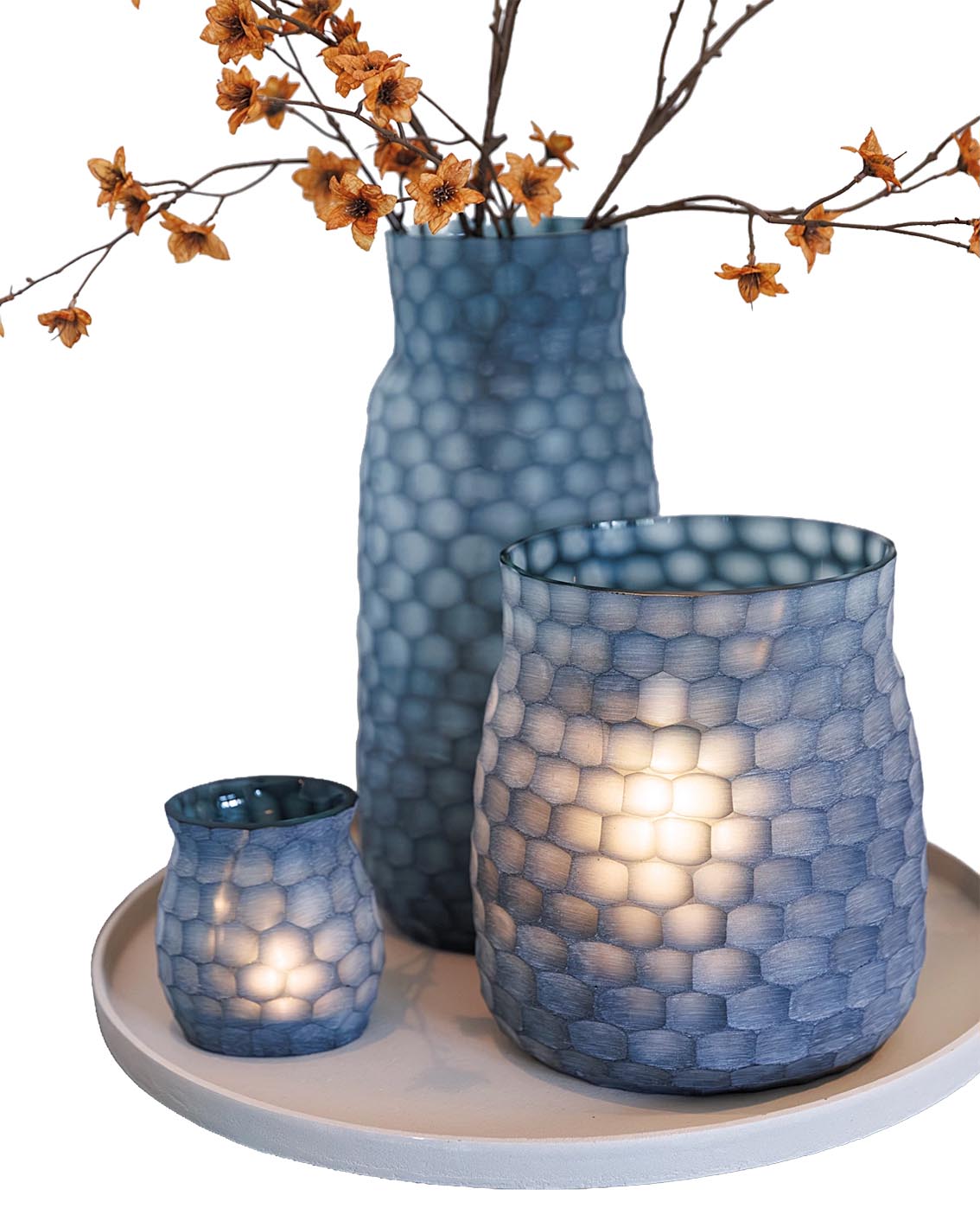 Trio de vase verre texturé. Entre motif alvéolé et nuances bleutées, chez Tendance Inside
