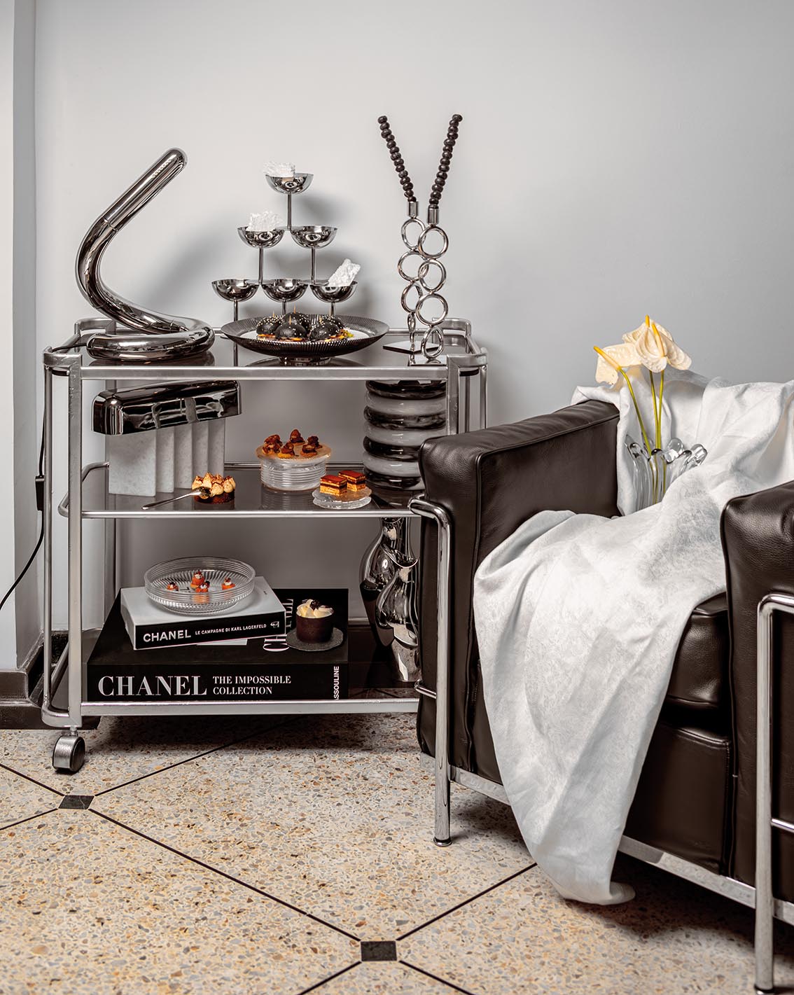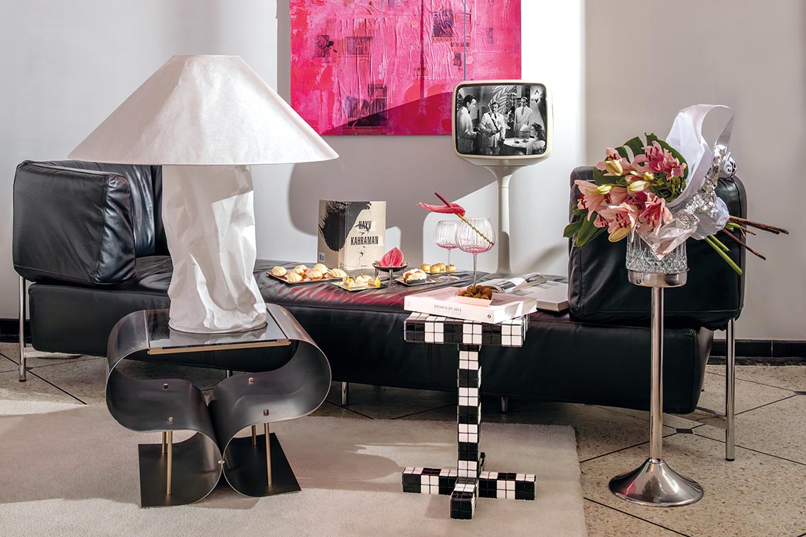 Le salon prend alors des allures de manifeste silencieux, entre modernisme et avant-garde. Métal, cuir, verre et fuchsia composent une palette dense, graphique, sentimentale.