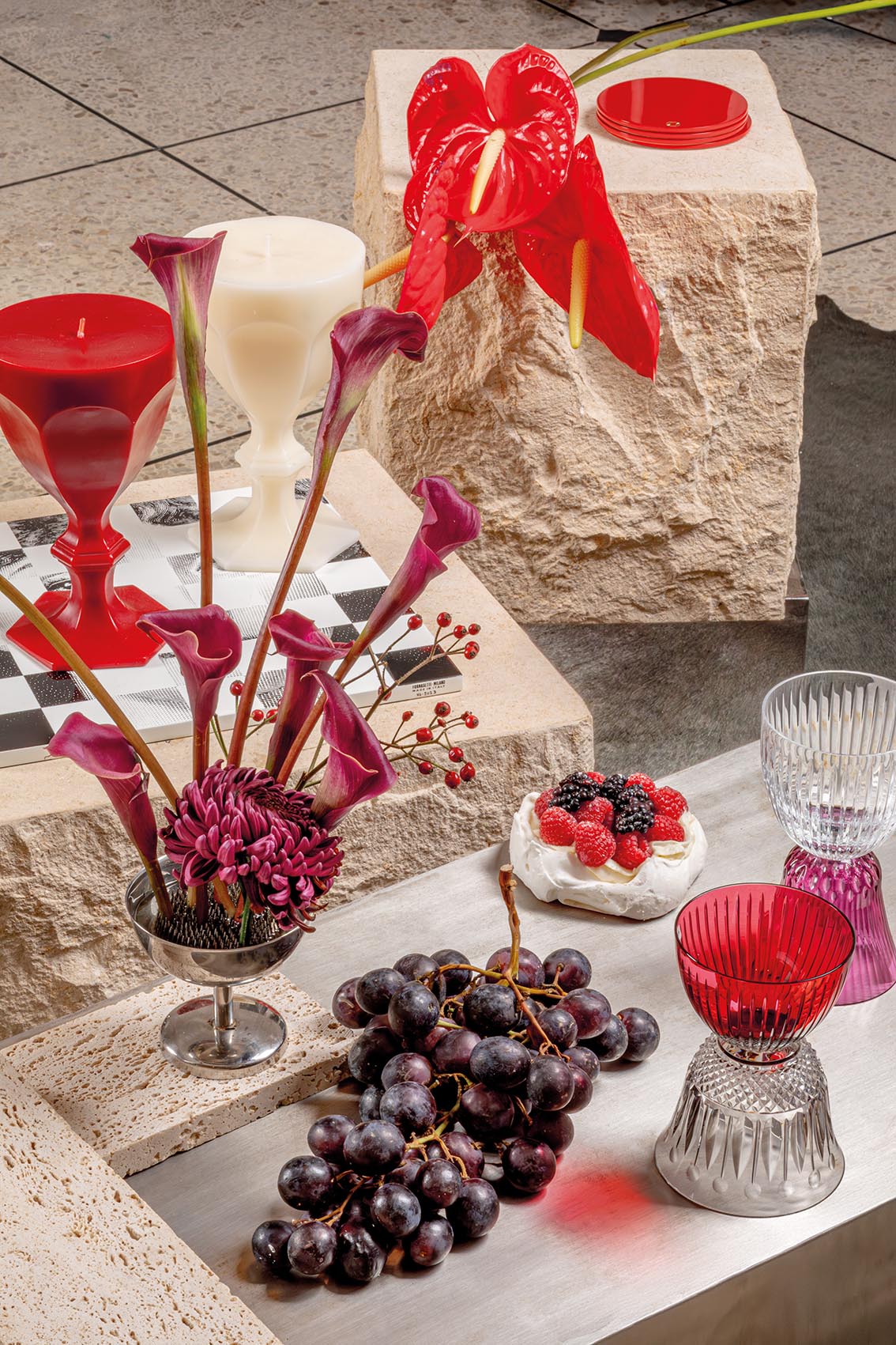 Nous composons cette table comme un collage minéral. Le travertin, la pierre brute et le marbre clair installent la structure, la couleur s’imprime dans l’espace avec intensité, rouge incandescent, violet profond, blanc crayeux. La lumière glisse sur les reliefs, révèle les textures, fait illuminer les verres cannelés et les fleurs sculpturales.