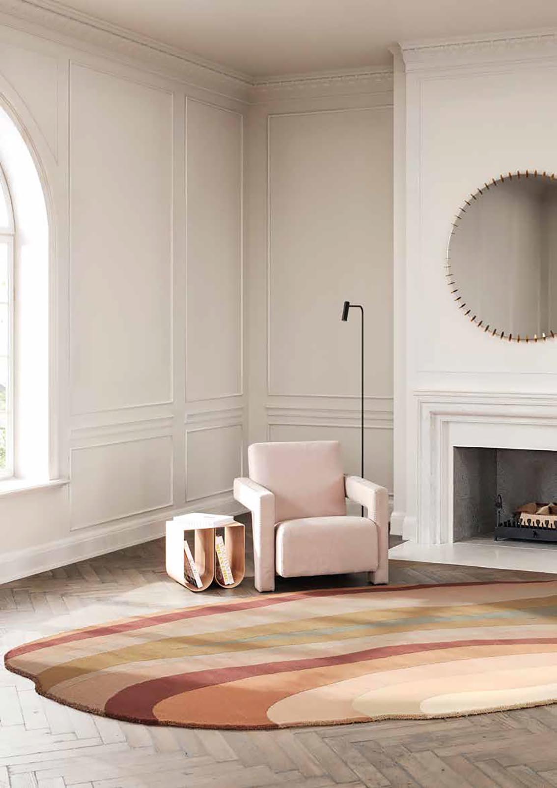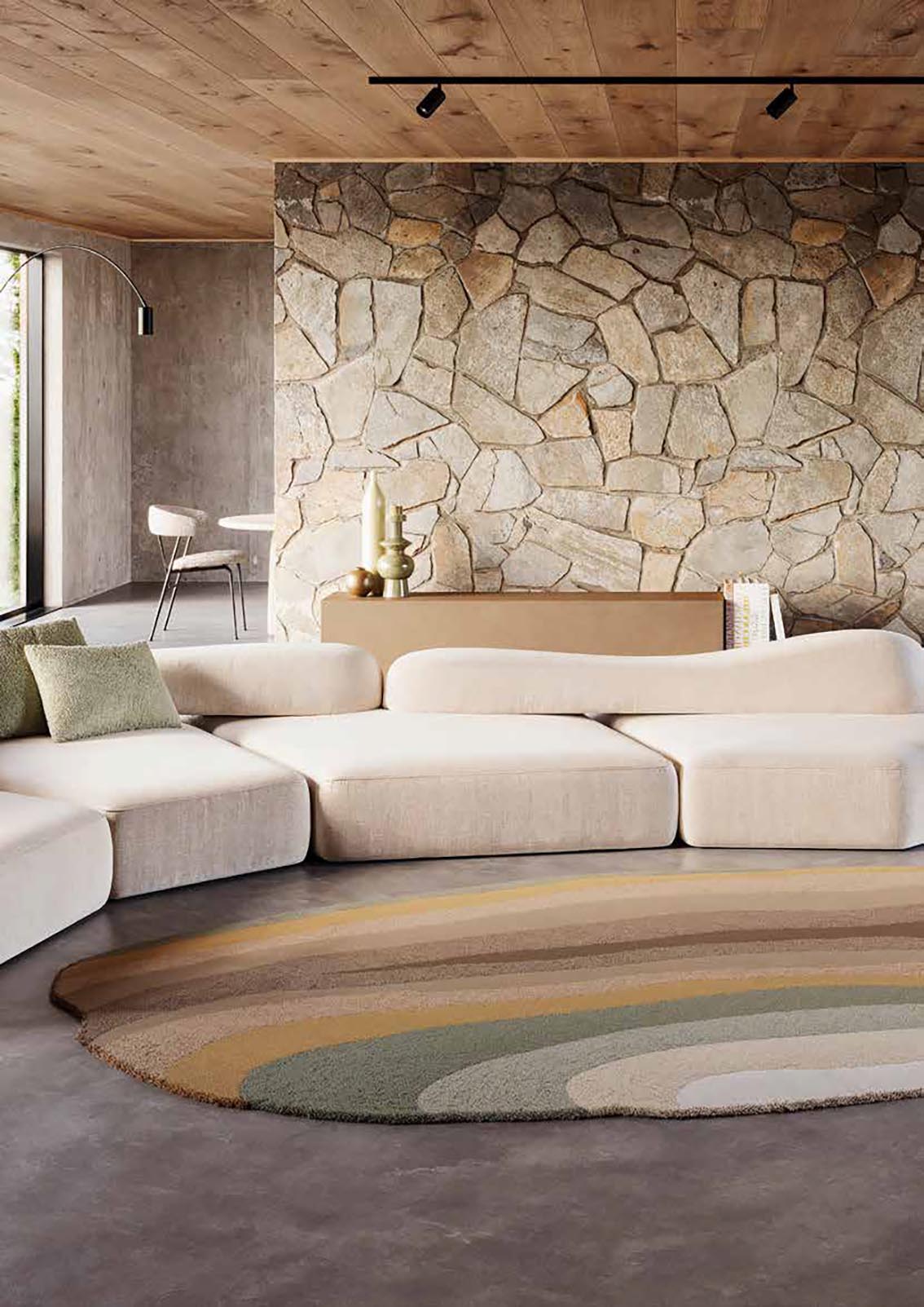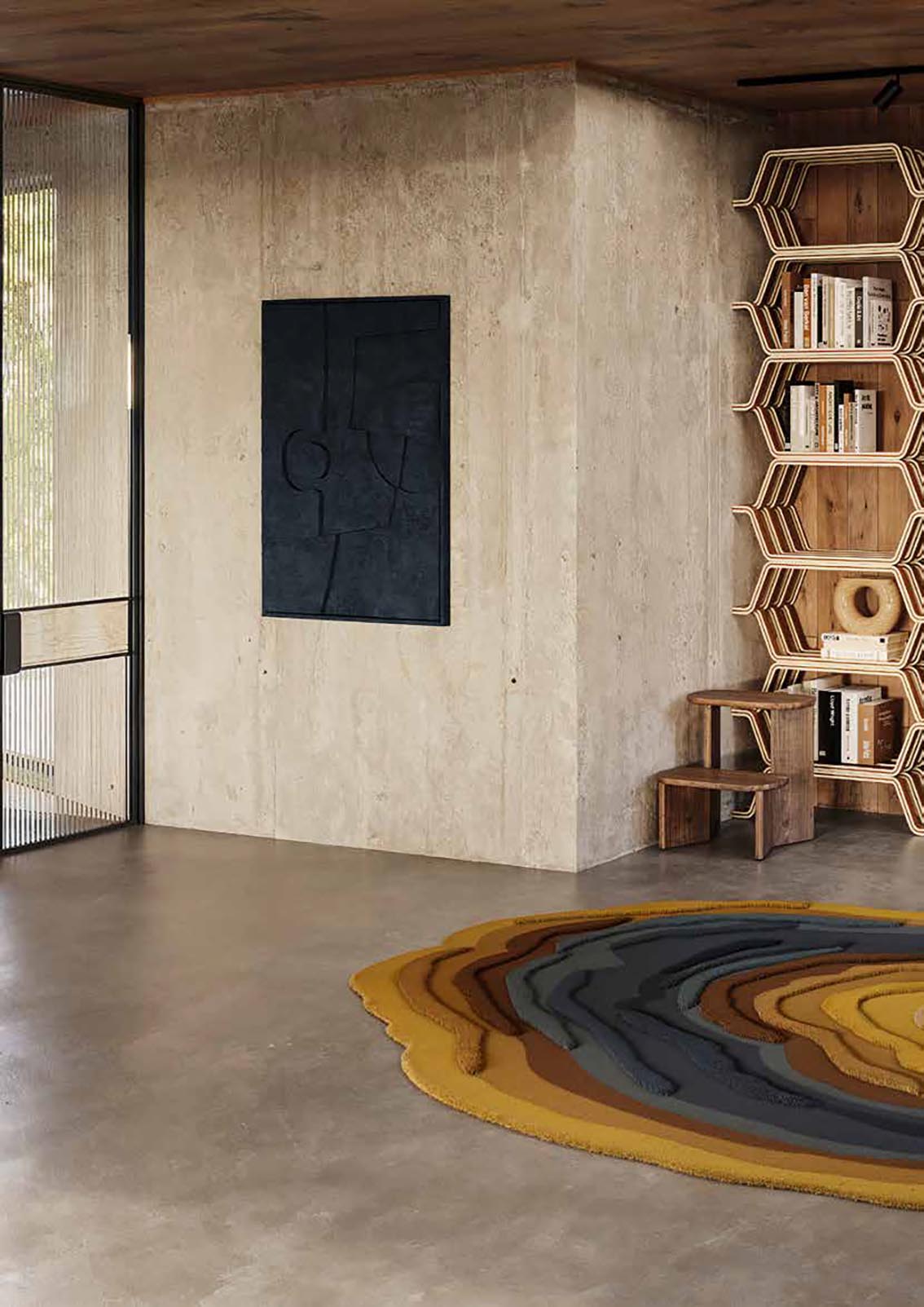 Chaque collection révèle une recherche minutieuse autour des matières naturelles : laine vierge, lin, soie, jute ou Tencel, sélectionnées pour leur éclat et leur toucher unique. À cela s’ajoutent des compositions innovantes, parfois hybrides, où les fibres se mêlent pour créer des effets de relief et de lumière. Le tapis devient alors une matière vivante, qui capte l’œil et donne du rythme à l’espace.