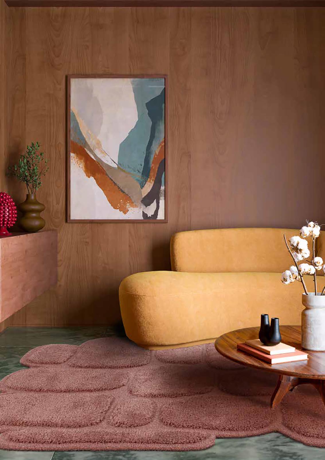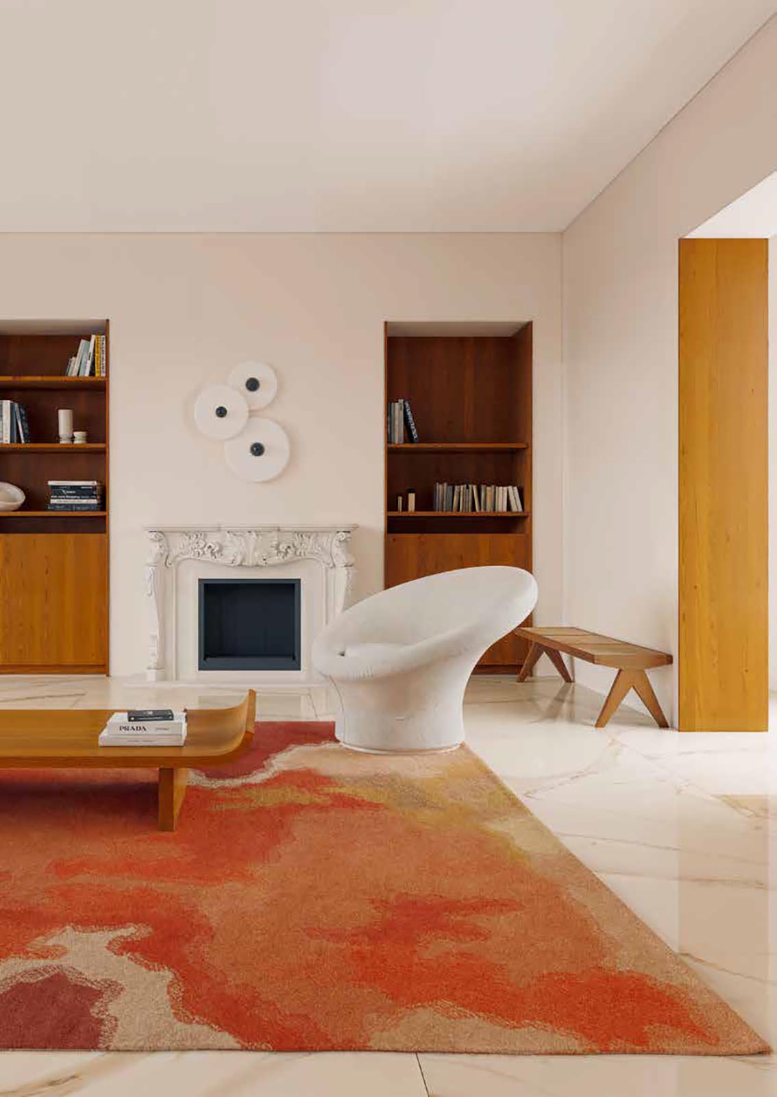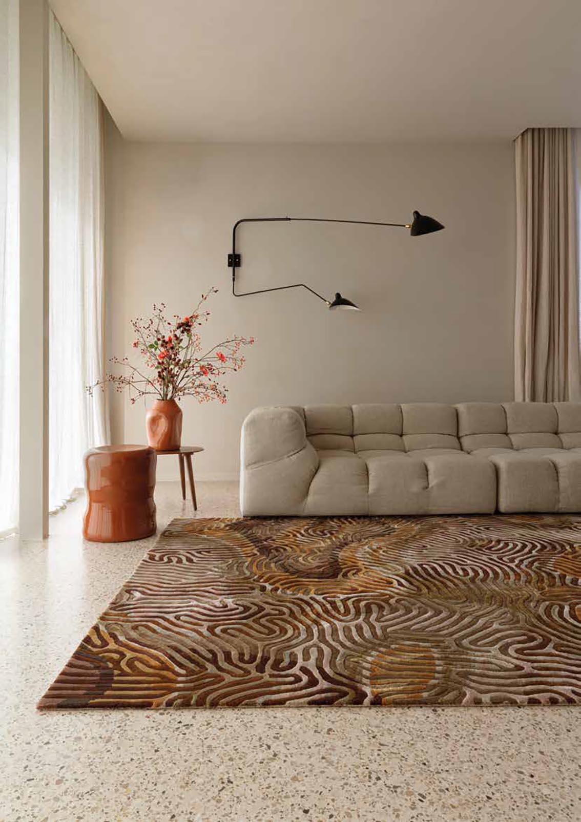 Chaque collection révèle une recherche minutieuse autour des matières naturelles : laine vierge, lin, soie, jute ou Tencel, sélectionnées pour leur éclat et leur toucher unique. À cela s’ajoutent des compositions innovantes, parfois hybrides, où les fibres se mêlent pour créer des effets de relief et de lumière. Le tapis devient alors une matière vivante, qui capte l’œil et donne du rythme à l’espace.