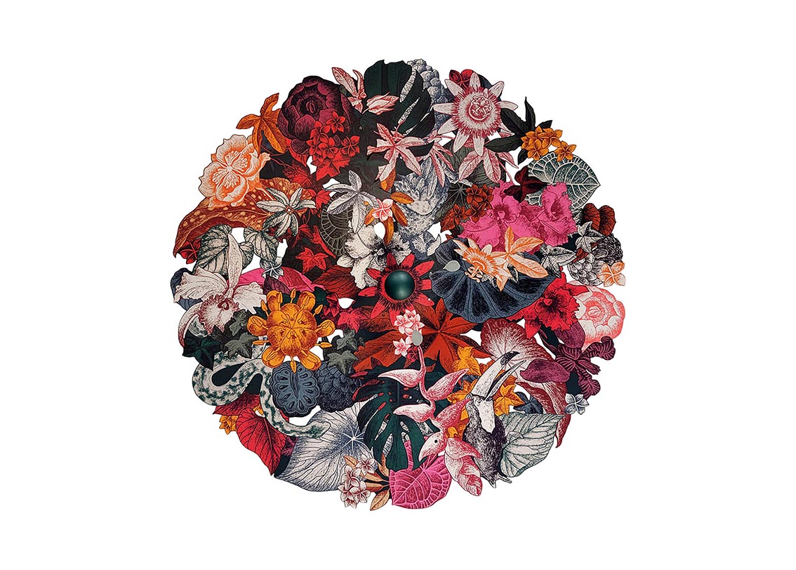 Avec Boucan, la lumière devient matière à composition. Feuillages, textures et silhouettes se superposent pour créer une présence dense, presque immersive. Entre motif et installation, la suspension transforme l’espace en scène vivante.