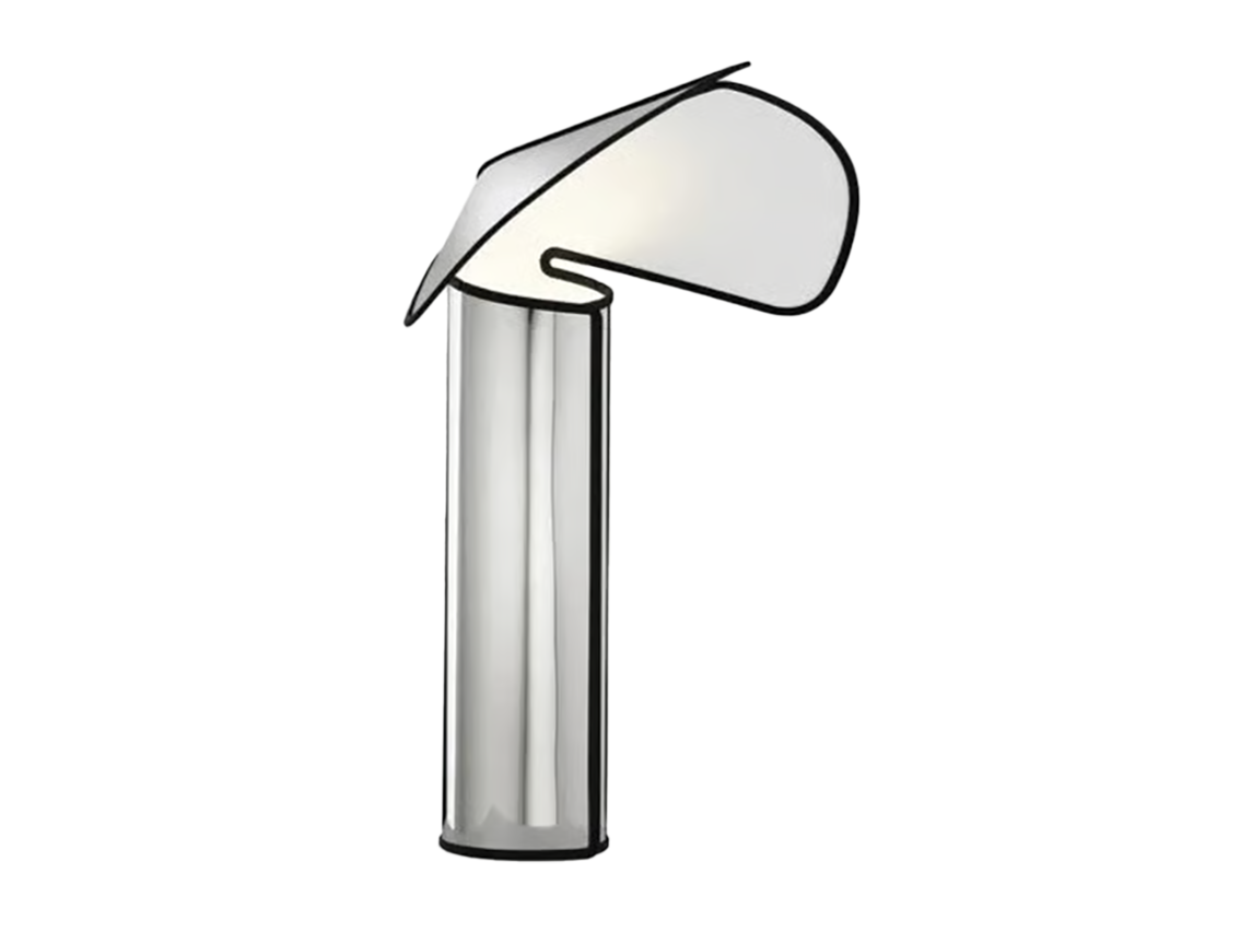 Chez Artemide, la lumière devient toujours matière et geste. Cette lampe illustre parfaitement cette approche avec une base cylindrique, stable et sobre, supporte un abat-jour qui semble plié d’un seul mouvement, comme une aile métallique figée en suspension. L’objet affirme une présence sculpturale, une tension entre précision technique et élan poétique. Une réflexion sur la manière dont la lumière peut devenir architecture.