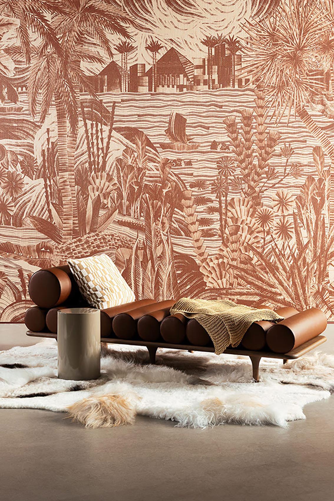 C’est dans cet héritage vibrant que s’inscrit la collection Luxor. Ses compositions géométriques rendent un hommage chaleureux à l’Art déco et à ses influences égyptiennes. Les tressages de fibres naturelles, inspirés des incrustations traditionnelles, sont réinterprétés grâce aux techniques d’impression les plus innovantes.