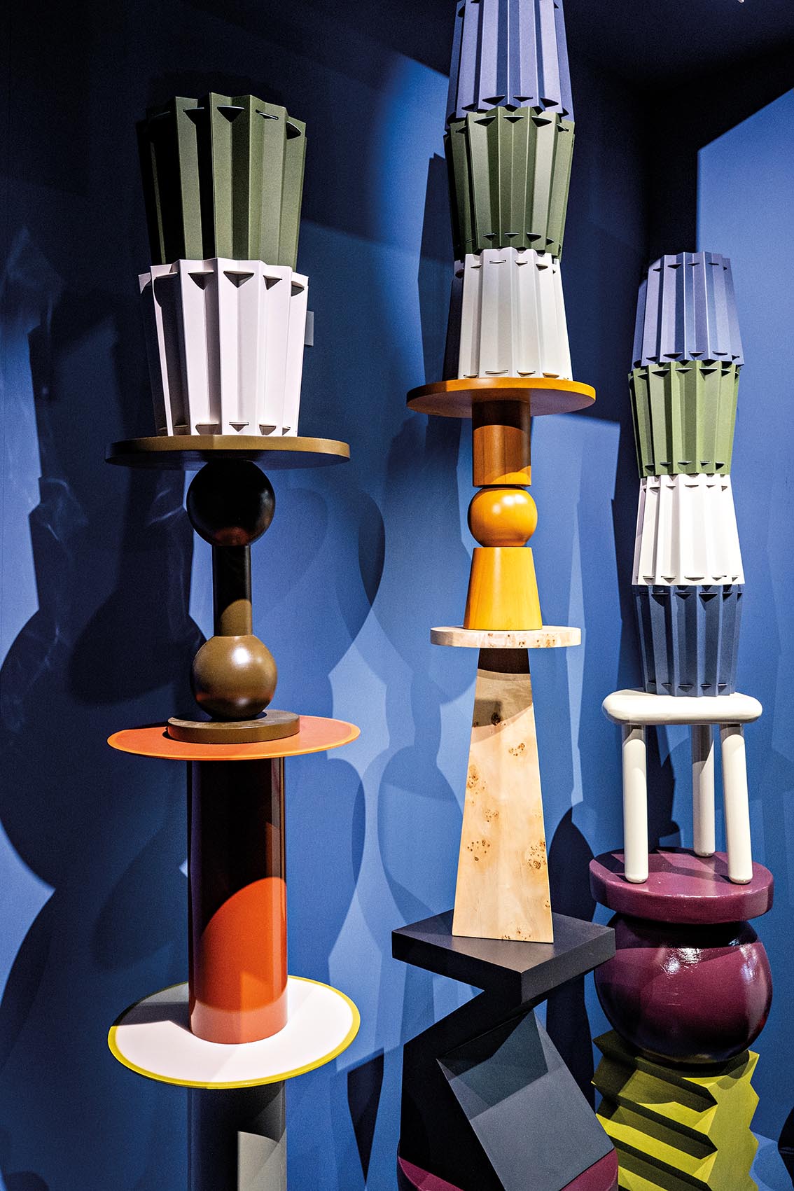 Néo‑folklore : colonnes colorées revisitant les totems. Les formes organiques et les teintes audacieuses racontent des récits locaux avec des codes contemporains à « What’s New ».