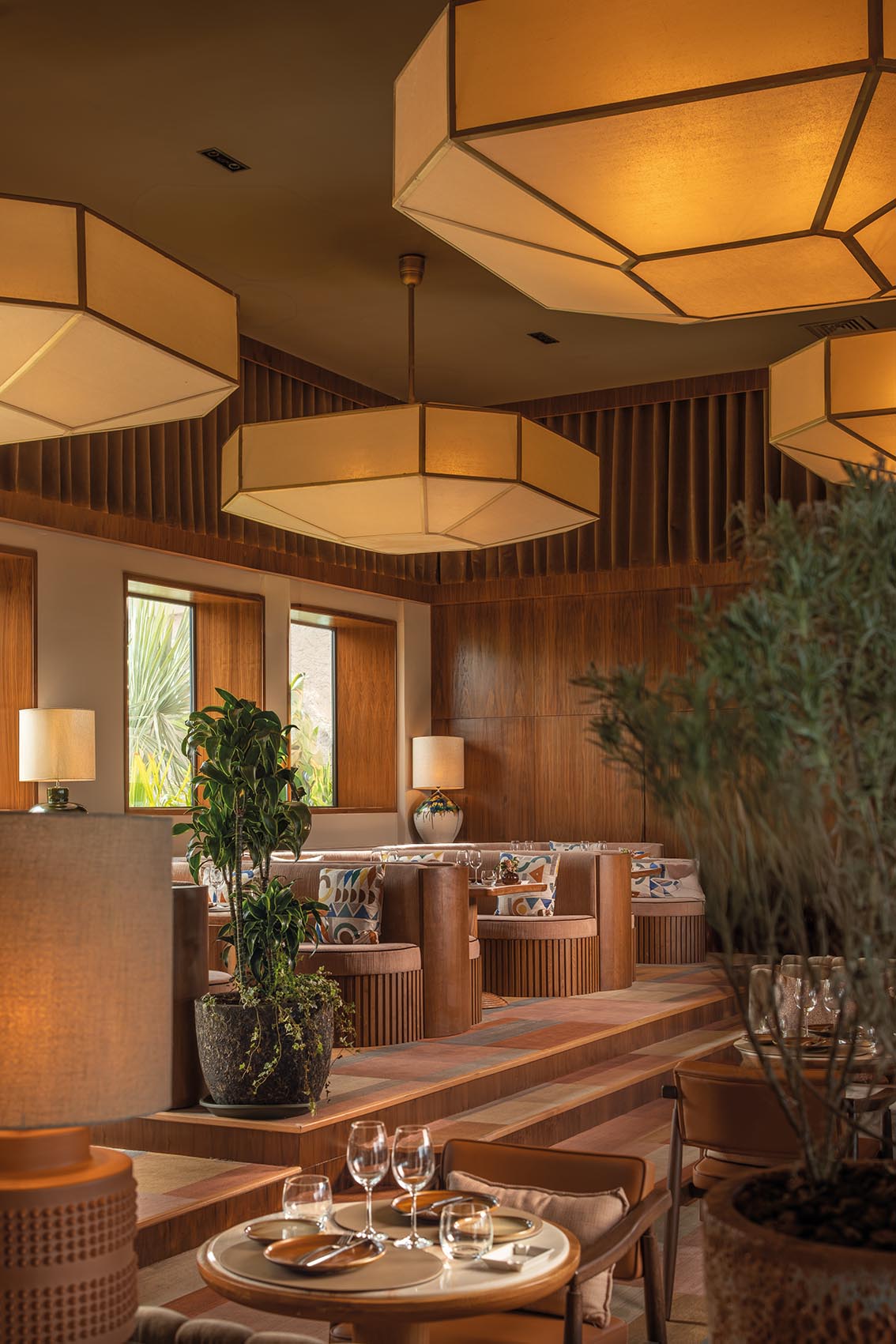 À l’intérieur, le décor joue une partition matières : boiseries structurées, marbres profonds, assises généreuses et éclairages feutrés composent un cadre à la fois cossu et actuel.