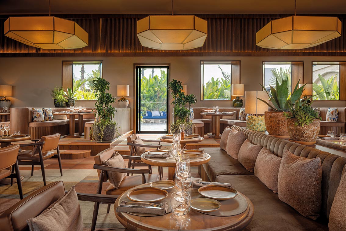 Selon les heures, Marion change de visage. À l’heure du déjeuner, la salle s’illumine d’une clarté franche qui met en avant la palette bois et sable. Au coucher du soleil, les suspensions prennent le relais, filtrent la lumière et enveloppent les tables d’un halo plus intimiste.