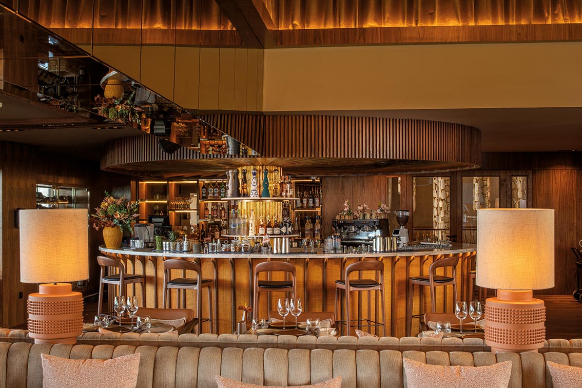 Le bar central devient un point d’ancrage : on y prolonge le dîner, on y revient simplement pour un verre en regardant la mer se fondre dans la nuit. Pensé dès l’origine comme un lieu d’all day dining, le restaurant se vit autant comme adresse de destination que comme véritable lieu de vie.