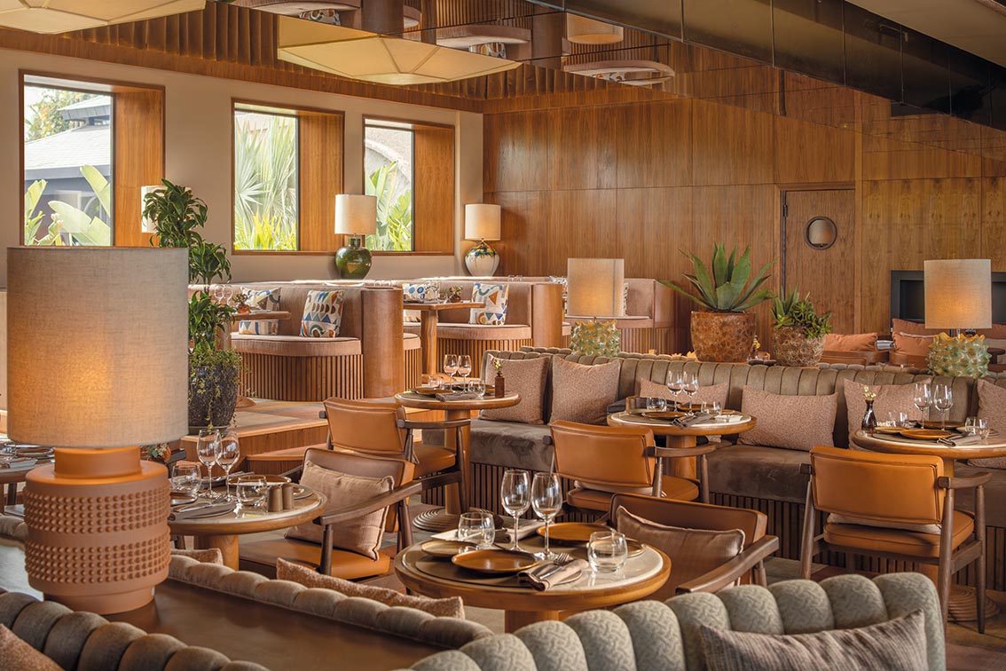 À l’intérieur, le décor joue une partition matières : boiseries structurées, marbres profonds, assises généreuses et éclairages feutrés composent un cadre à la fois cossu et actuel.