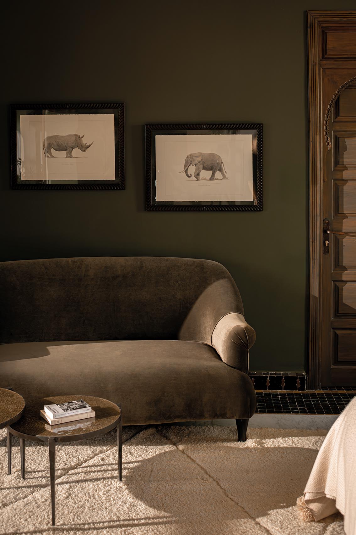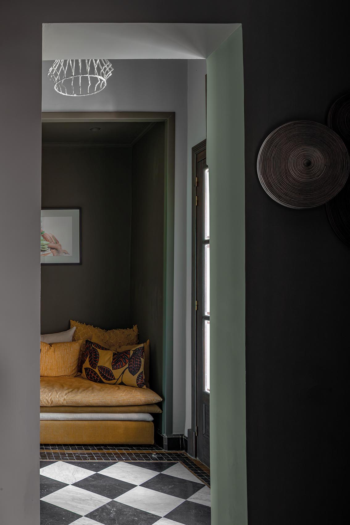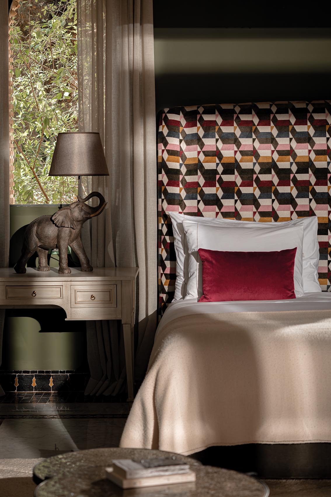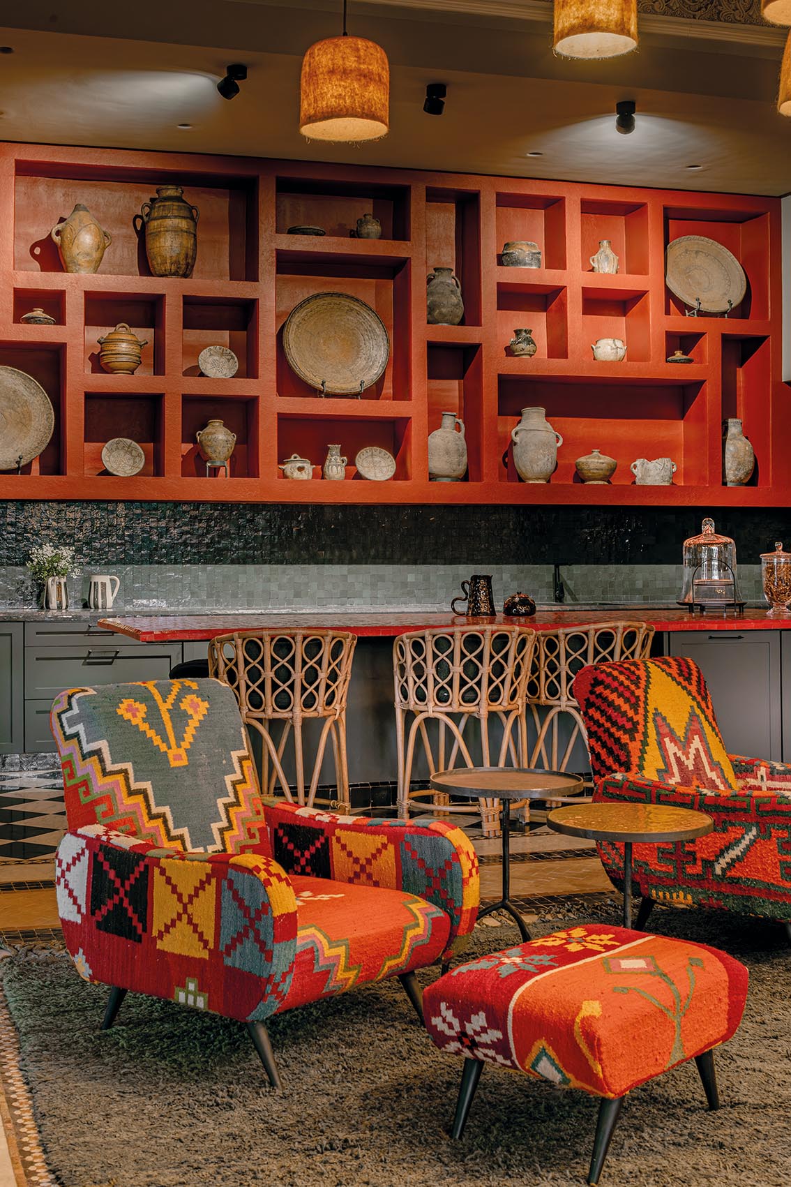 Dans la cuisine, un rouge profond dialogue avec le vert sourd des murs. Les poteries, paniers et pièces artisanales trouvent leur place dans les niches, comme un inventaire vivant de savoir-faire local. L’îlot en zellige sert de point d’ancrage, pensé autant pour cuisiner que pour rassembler.