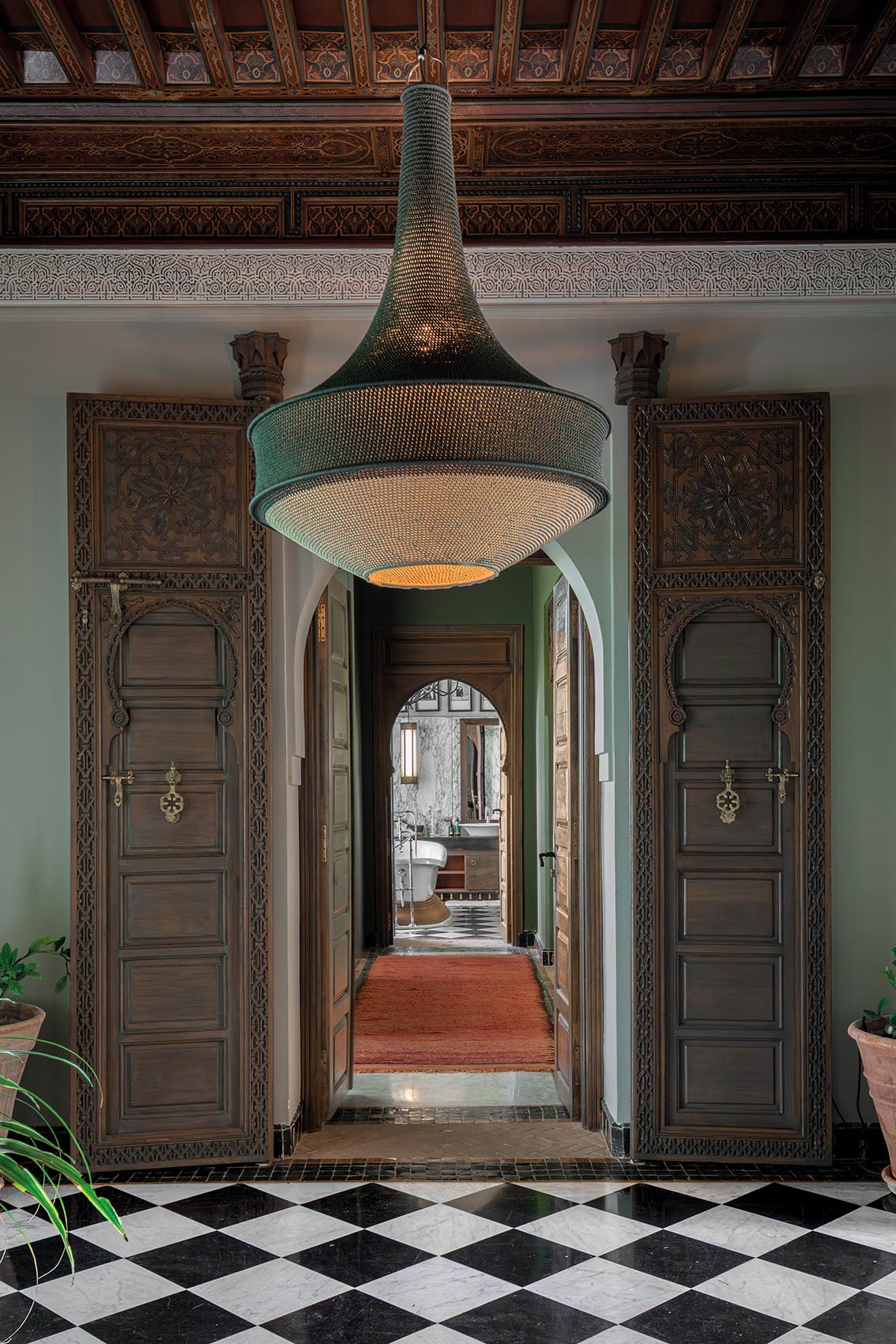 L’entrée fixe les lignes de la maison, une enfilade de portes ouvragées, des perspectives profondes, un sol en damier qui conduit le regard. La lumière traverse les pièces et révèle les boiseries et l’ampleur des arcades. Les seuils fonctionnent comme des marqueurs, cadrent la transition et accompagnent les volumes. Les espaces s’articulent avec clarté autour d’un axe lisible.