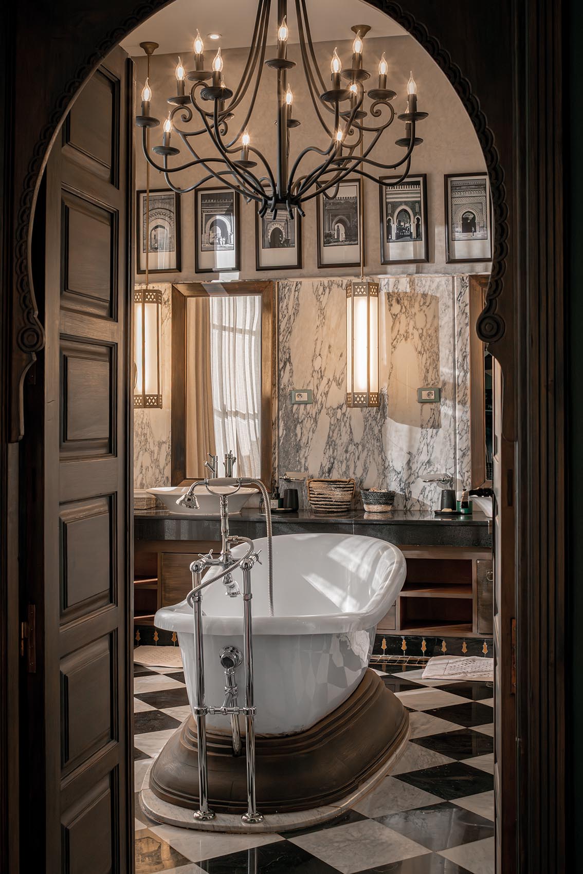 La salle de bain associe marbre veiné, boiseries sculptées et baignoire sur socle, créant une atmosphère intime et élégante.