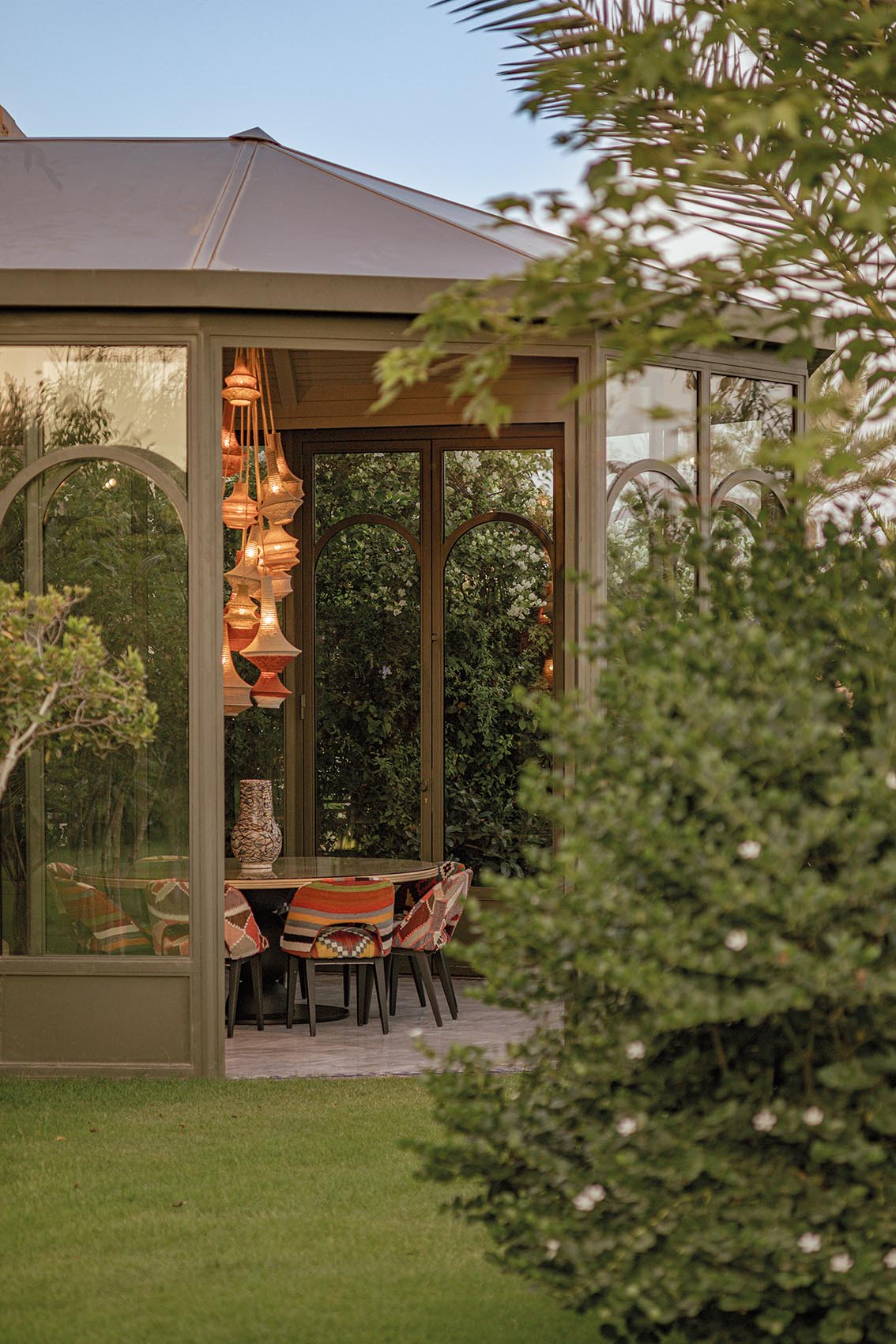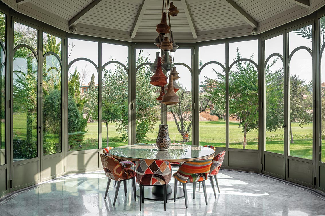 Plus loin, la rotonde vitrée s’ouvre largement sur le jardin. La table ronde occupe le centre, entourée de chaises habillées de kilims aux teintes chaudes. Une suspension tressée accompagne la verticalité du volume. Le jardin devient, lui aussi, un arrière-plan permanent, garantissant une continuité naturelle entre les pièces.