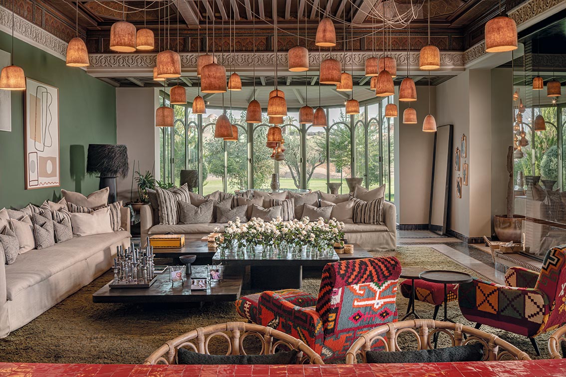 Le grand espace de vie sert de cœur à la maison. Sous le plafond à motifs peints, les suspensions en fibres naturelles diffusent une lumière douce qui enveloppe la pièce d’une chaleur généreuse. Les tapis et textiles amazighs, ponctués de motifs géométriques, apportent une note immédiate de confort et rappellent l’artisanat marrakchi. L’ensemble repose sur une continuité de matières et de couleurs, créant une ambiance habitée, stable et cohérente.