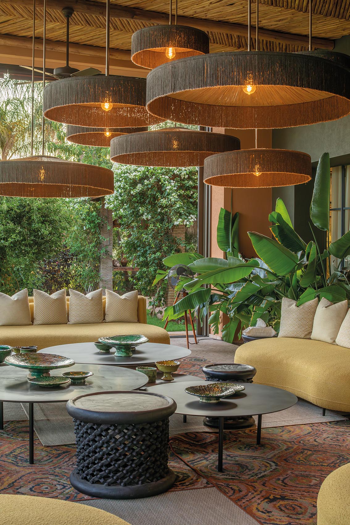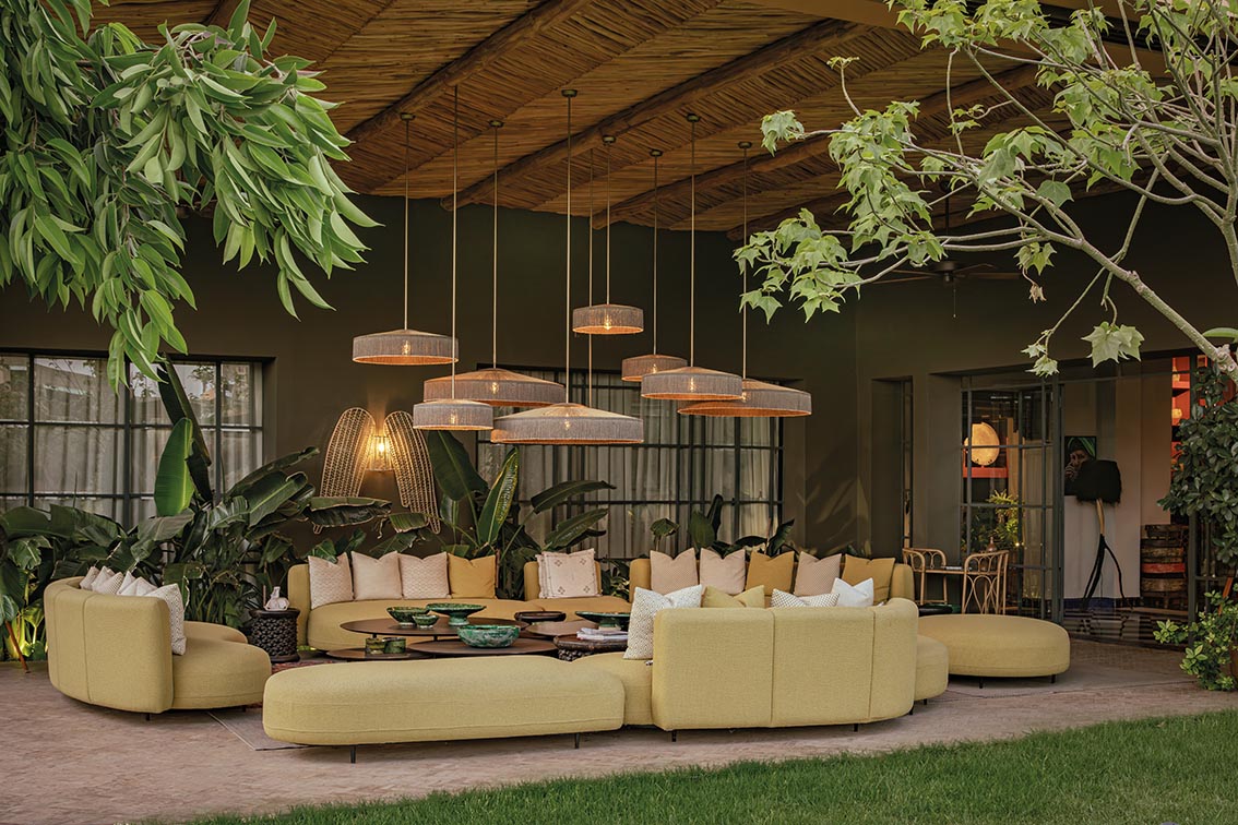 À l’extérieur, les aménagements prolongent directement l’atmosphère intérieure. Banquettes profondes, tapis graphiques et tables en métal sombre s’intègrent dans une végétation dense.