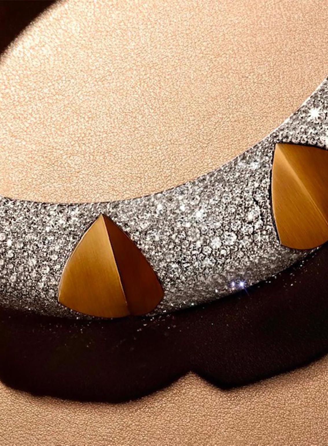 Ici, l’or se fait sable, la lumière se fait mouvement, les lignes s’étirent et s’entrechoquent dans un langage viscéral. Entre Kalahara, totem transformable orné d’un diamant jaune de 34,92 carats, et les ensembles Mirage, Zebra Mnyama ou Fauve, la créatrice explore les dualités : force et fluidité, ombre et éclat, terre et lumière.
