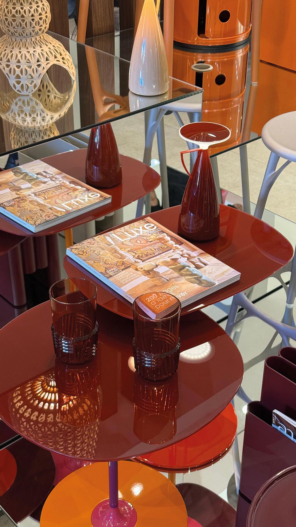 L’espace, pensé comme une expérience à part entière, met en scène un dialogue entre les pièces emblématiques de Kartell — signées notamment par Philippe Starck, Patricia Urquiola ou encore Ferruccio Laviani — et les créations les plus récentes. À travers une scénographie sobre et lisible, la marque expose son ADN : formes iconiques, matériaux innovants et approche transversale du design.