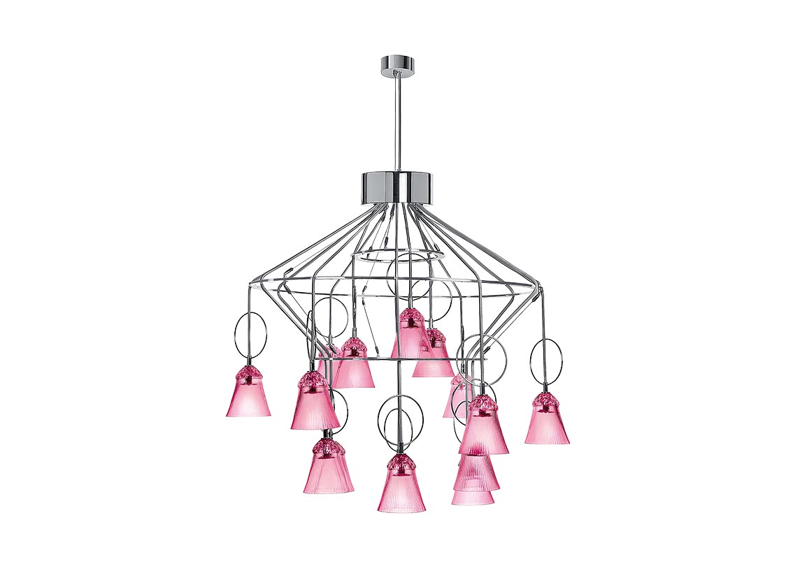 Imaginée par Godefroy de Virieu et Stefania Di Petrillo, cette suspension compose une présence lumineuse à la fois graphique et délicate. Les pampilles aux reflets améthyste diffusent une lumière douce, presque atmosphérique. Entre geste verrier et écriture contemporaine, la pièce s’inscrit comme un objet à la fois fonctionnel et sculptural.