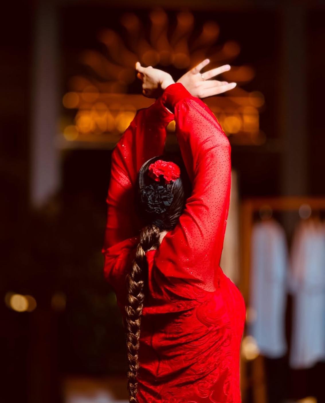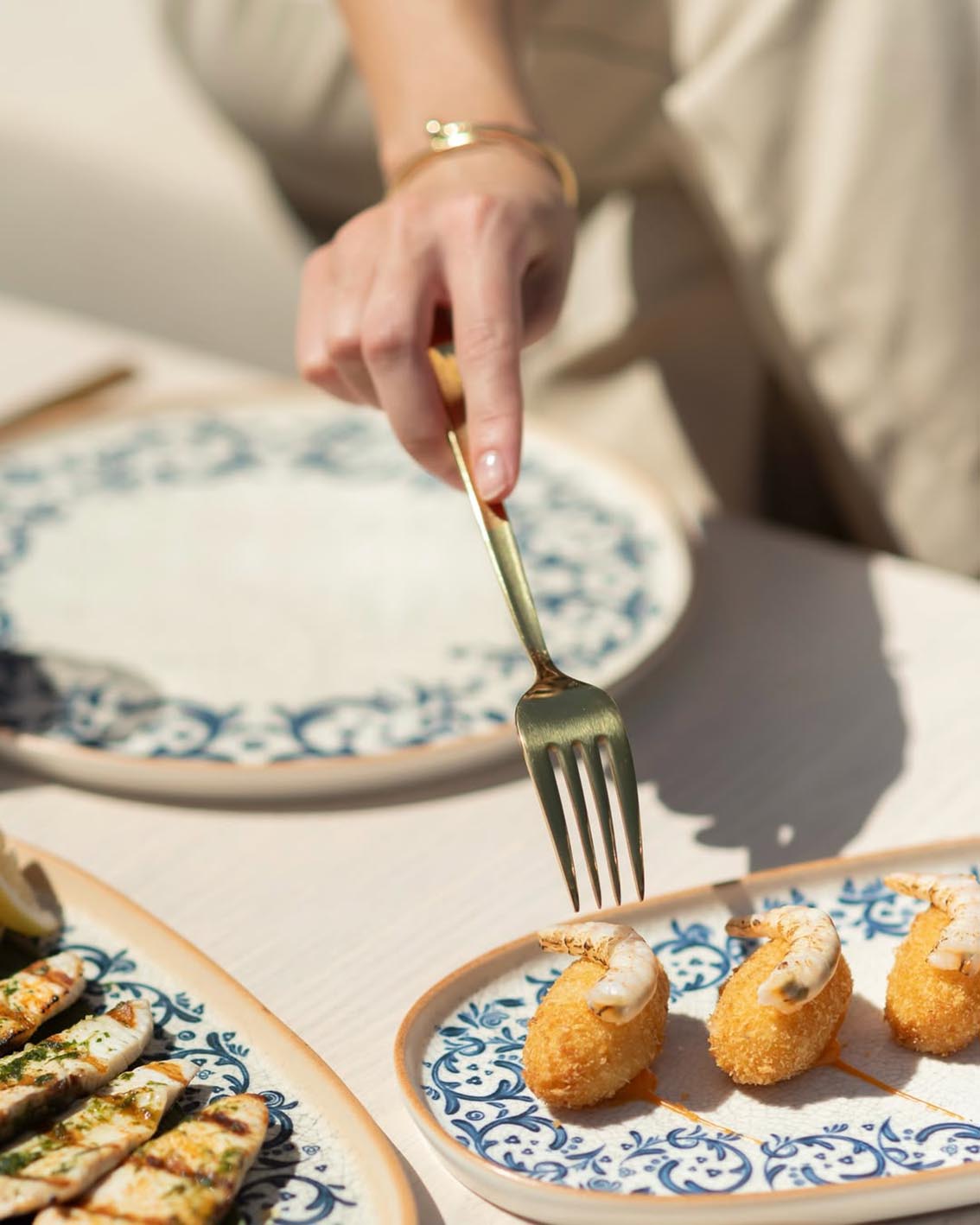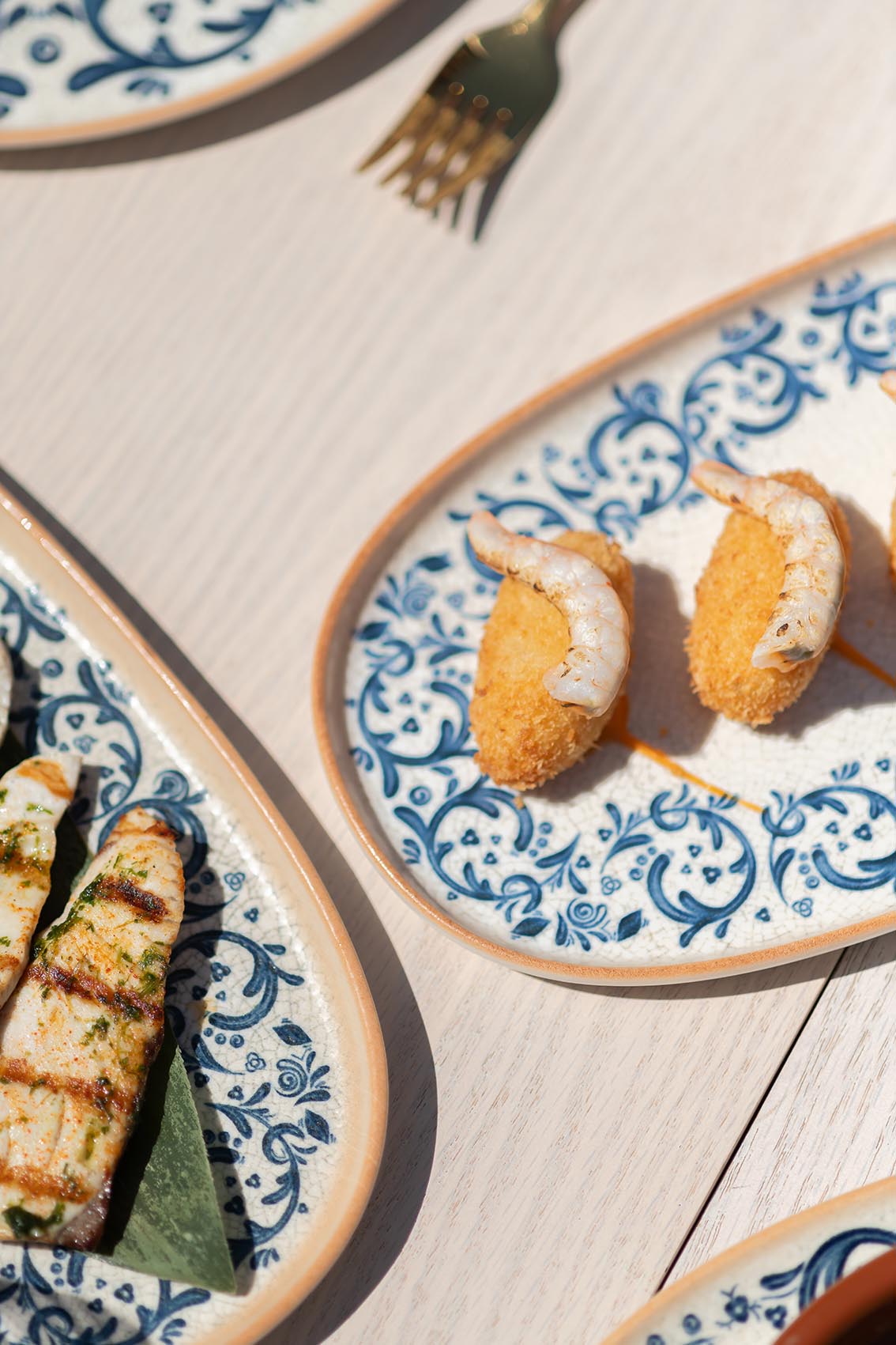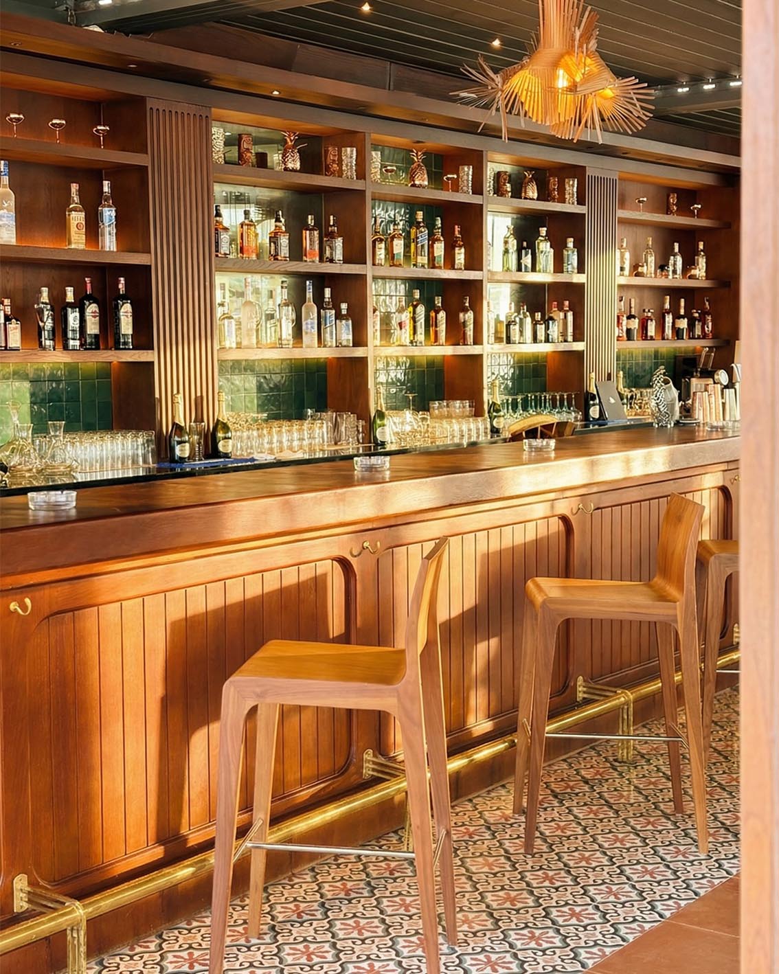Dès l’entrée, le décor donne le ton. Un bar monumental de 12 mètres, des céramiques artisanales, du linge brodé et des faïences importées composent une atmosphère inspirée d’une Andalousie rêvée. L’architecture intérieure joue sur des volumes généreux et une lumière cuivrée, créant un espace vivant où chaque détail raconte une histoire.