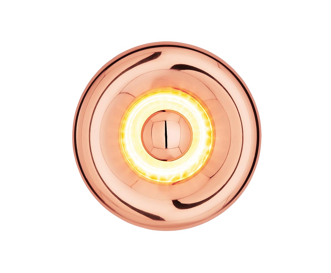 Avec ses reflets métalliques profonds, cette lampe capte la lumière et la diffuse en halo doux. La forme, à la fois lisible et sculpturale, installe une présence silencieuse, entre objet et architecture.